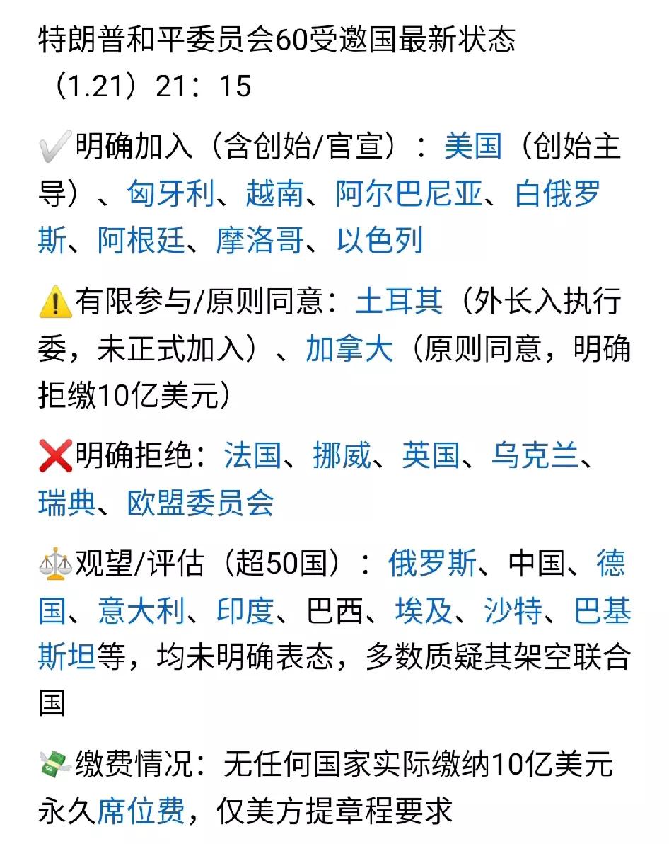 [奇了,法国和英国为何拒绝加入美国主导的"和平委员会"?] 同为西方阵营,法国和英国己明确拒绝加入美国主导的和平委员会,丝毫不给带头大哥的面子。似乎让人诧异。 尤其是英国,它还是撒盎系统的国家,与美国有相近的文化血脉,也对美国伸出的橄榄枝嗤之以鼻。 为什么?有人说两国正因为美国在俄乌战争中偏袒俄罗斯呕气的,其实和这件事没有一毛钱的关系。 直实原因是美国成立和平委员会的实质目的是为了架空联合国,但英法并不想架空联合国。 英法在联合国中很受益。作为只有6千万人口的小国,却能成为联合国安理会常任理事国,这对英法己是最好的结果了。 英法之所以能成为联合国常任理事国,既有二战结果,又有传统声威。历史上英法是强国,拥有大量殖民地。后来殖民地瓦解了,英法成了6千万人口的小国,但依历史惯性,仍保留了在联合国安理会常任理事国的位置,和中美俄平起平坐。 假如英法加入和平委员会,以他们现在的体量,不可能再在和平委员会常任理事国中谋到位置,甚至不如巴西、德国、日本、印度和土耳其这些国家。