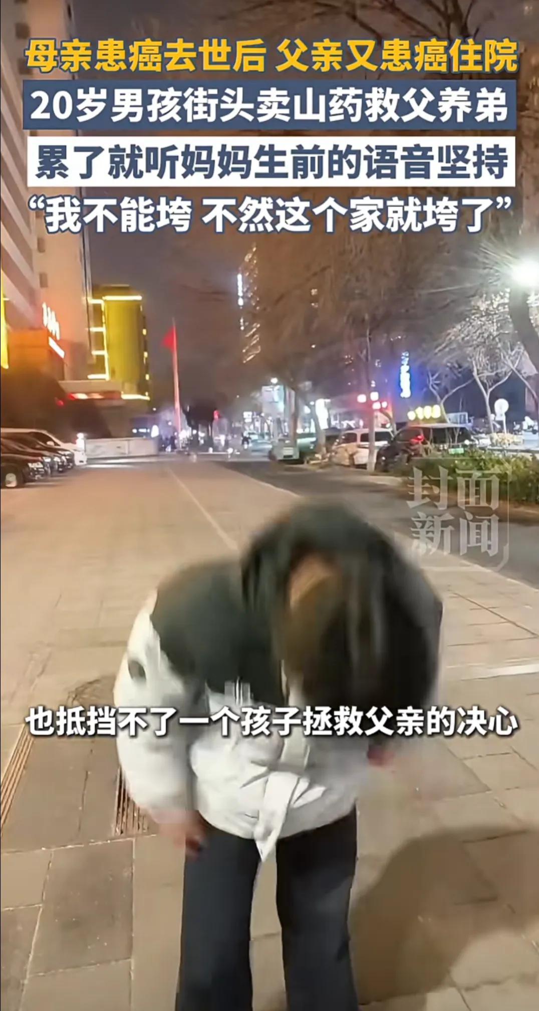 破防了!河南郑州,20岁大三男生为给父亲筹治疗费,暴雪夜在街头直播卖山药,冻得直搓手还在坚持。男生:“母亲4个月前重病去世,如今父亲也得了重病急需救治,家里还有个上初三的弟弟。我是家里的顶梁柱,我必须赚钱救爸爸,我不能垮,不然这个家就垮了!” 小孟穿着那件袖口磨起球的拼色羽绒服,站在街边的路灯下,手机架在纸箱上,屏幕里的他鼻尖冻得通红,说话时哈出的白气在镜头前晃。面前的编织袋里堆着好心人捐来的山药,他一边搓手跺脚,一边对着镜头笑着喊。 才20岁的年纪,同龄人还在宿舍里打游戏、跟朋友约着吃火锅,他却已经在医院和街头之间连轴转,白天在医院陪床给爸爸喂饭,晚上就扛着山药站在冷风里直播到深夜。 医保报销后剩下的治疗费像座大山,亲戚朋友能借的都借了,他能想到的最体面的办法,就是靠自己卖山药凑钱。没有哭天抢地,没有伸手乞讨,这个20岁的男孩只是用冻得发红的手,一根一根捡起地上的山药,对着镜头重复着“谢谢家人们”。 我们总说“少年不知愁滋味”,可有些孩子的愁,是从医院缴费单上的数字开始的。小孟的直播间里,有人下单几十斤山药,有人直接打赏几百块,不是因为山药有多特别,是大家都懂那种“想留住亲人”的心情。这不是一场“流量狂欢”,是普通人在互相托举。 一个大三学生要靠暴雪夜卖山药救父,本身就透着无奈。他的这种行为戳中了无数人的心弦。 生活不会一帆风顺,困境时常不期而至,但责任与爱能抵御一切风浪,坚持和勇气也能让人度过困境。在人情冷暖中,总会有不期而遇的善意与力量。希望小孟的坚持能换来奇迹,也希望每一份孝心都能被温柔以待,更希望在困境中不放弃、绝境中仍守初心的精神,能激励更多人勇敢前行。 各位读者你们怎么看?欢迎评论区讨论。