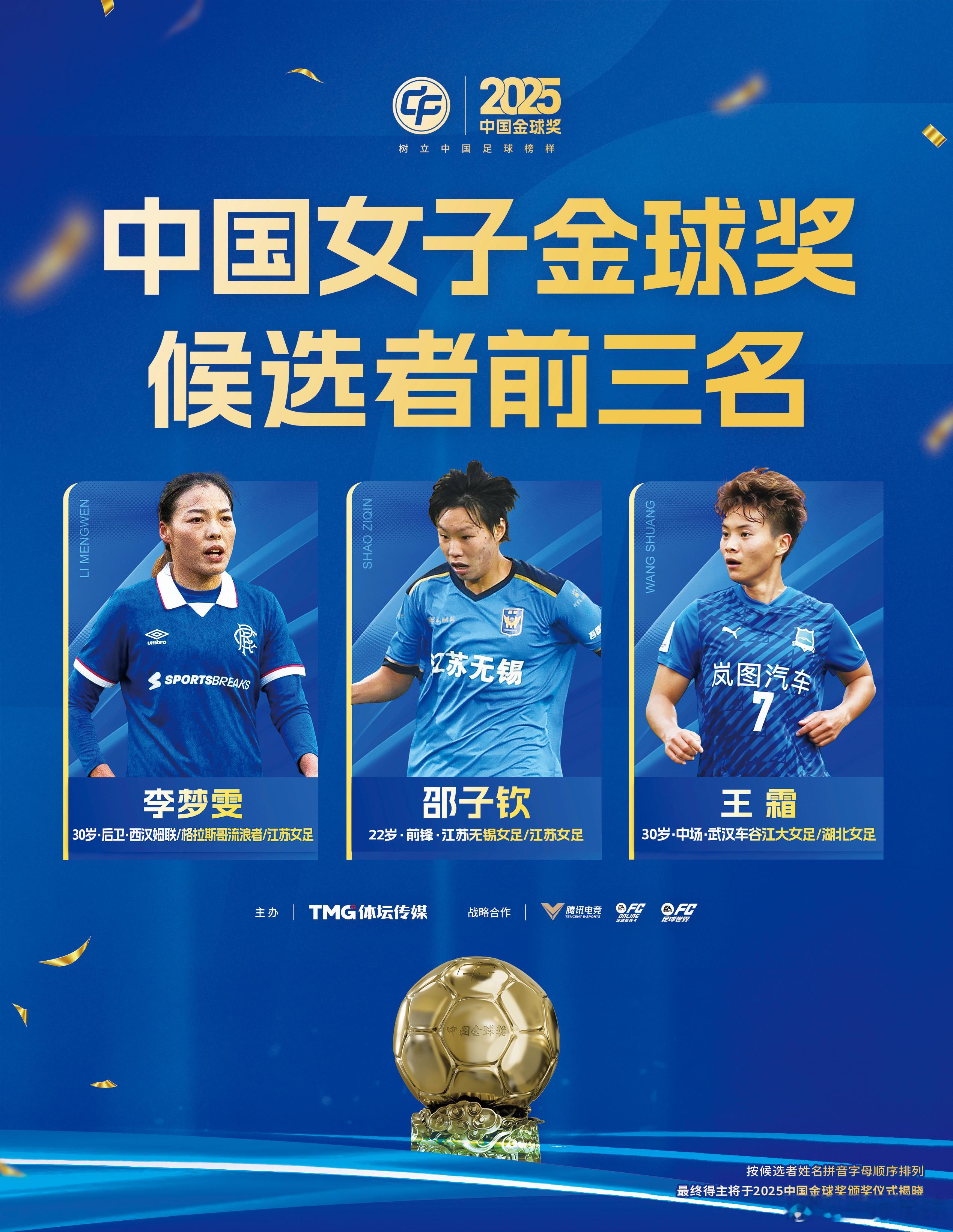 2025中国金球奖 各奖项前三名揭晓,和武汉有关的奖项都来自武汉江大女足!感觉机会都挺大的!王霜👉中国女子金球奖常卫魏👉中国金帅奖陈晨👉金手套奖2025中国金球奖候选前三公布武汉足球