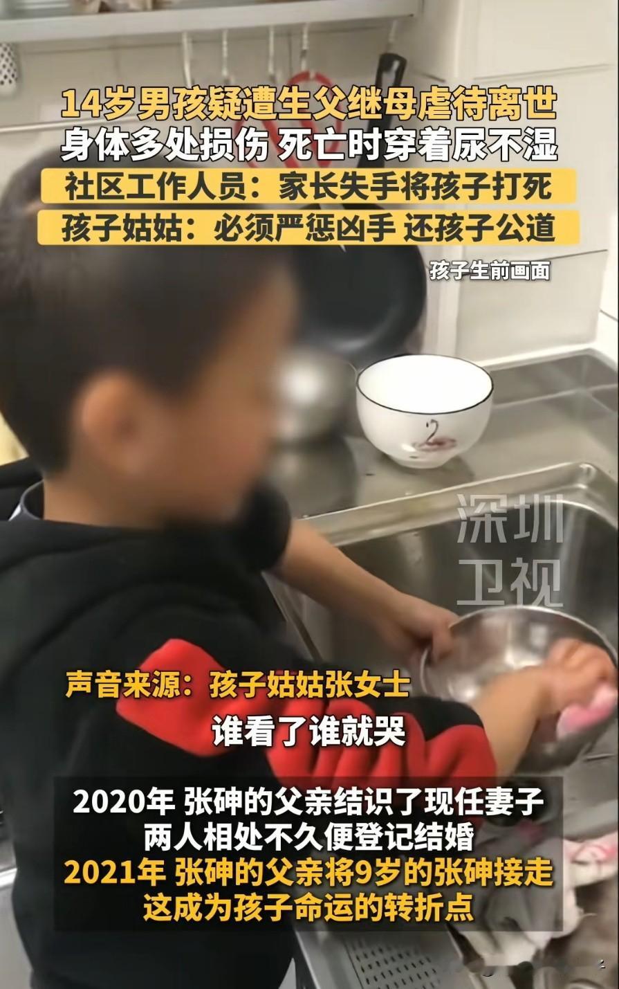 太可怜了!河南14岁男孩被生父继母虐待4年后去世,男孩姑姑发声,同样是生活在一个家庭里,继母的孩子长得白白胖胖的,她侄子就饿得瘦骨嶙峋,满身都是淤青伤痕。 在男孩还没满1岁时,父母就离婚,母亲抛下他走了,父亲离家去外地打工,男孩由奶奶和姑姑抚养,虽然没有亲生父母陪伴,但男孩还挺活泼开朗,会主动帮着做家务,生活也还算幸福。 直到男孩9岁前,父亲母亲都没有回来看过他一次,2021年,父亲回到家里说他给男孩找了个后妈,要接走男孩,姑姑原本不同意,但因为不是直系亲属,也阻拦不住,只能让弟弟带走男孩。 几个月后,姑姑在学校外看到侄子,发现男孩满脸淤青,便带回来给他擦药,没过多久,男孩跑到姑姑家说,爸爸和继母经常打他,不给他饭吃,他饿得前胸贴后背,还说不让去读书。 于是姑姑找到弟弟商量,提出以后男孩由他来抚养,生活费也不用他出,但弟弟怎么也不同意,姑姑说,弟弟应该是想通过孩子和母亲要钱,以前弟弟都不这样,自从结婚后就变了,肯定是他找的老婆出的主意。 随后的几年,父亲居然直接禁止姑姑和奶奶等亲戚看孩子,反而经常找到奶奶要钱,直到2025年10月5日,中秋节这天,男孩在家中离世。 孩子去世时,身上还穿着纸尿裤,对继母说的最后一句话是,能不能给他一口水喝,随后父亲主动报警,称他是管教孩子时失手了,和继母没关系,把一切责任都揽到他身上。 孩子姑姑认为,这一切都要怪继母,就是因为她,弟弟才和家里闹翻的,她经常打孩子,对她亲生的儿子却很好,必须严惩他们两人,为孩子讨回公道! 许金花夫妇就是他们的下场,必须严惩!