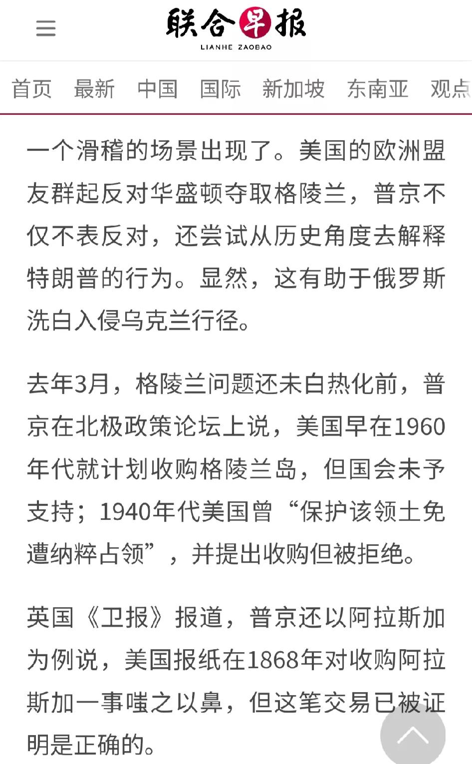 [普京默许美国夺取格陵兰岛,甚至为川普的行为开脱。] 根据联合早报的报道(下图),普京在去年3月的北极论坛上曾表示,美国曾在1940年就提出过购买格陵兰岛,当时理由也很充分,因为美国不拿,纳粹德国也可能拿。但美国国会不同意,错过了一次机会。 普京还举了个例子,说当年美国购买阿拉斯加,美国媒体也各种嘲讽,认为愚蠢,但历史证明美国做得对。 普京的意思很明确,暗示美国拿下格陵兰岛是个正确的决定。也表明了他和川普的关系。 观察家认为,考虑到俄罗斯在乌克兰的一系列行为,普京这样说完全是可以理解的——彼此惺惺相惜… (下图为联合早报的相关报道。)