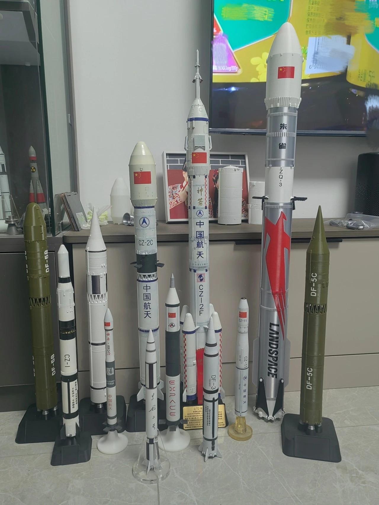 图片上是中国部分导弹和火箭的缩小比例模型,有东风5B、东风5C、长征1号、长征2C、长征2F、长征11、东风3、朱雀3号等等。 中国的导弹和运载火箭,分别代表了国防实力和航天探索能力,两者协同发展,互相构成了国家战略实力的重要支柱。 过去10年中国共有28种新型火箭实现首飞,其中不乏民营企业的成果。 代表型号有:朱雀二号,这是全球首款成功入轨的液氧甲烷火箭。 双曲线二号,这是可重复使用验证火箭。 引力一号,这是全球最大固体运载火箭。 中国的导弹与火箭共同构成了国家战略实力的两翼。 导弹体系以长剑、东风、巨浪等系列为代表,向高超声速、强突防、体系化核威慑的方向演进,形成了可靠的战略防御与威慑能力。 运载火箭以长征系列为基石,商业火箭为新生力量,正朝着大运力、低成本、快速响应和可重复使用的方向迈进,支撑着中国从卫星应用到载人登月的广阔太空梦想。