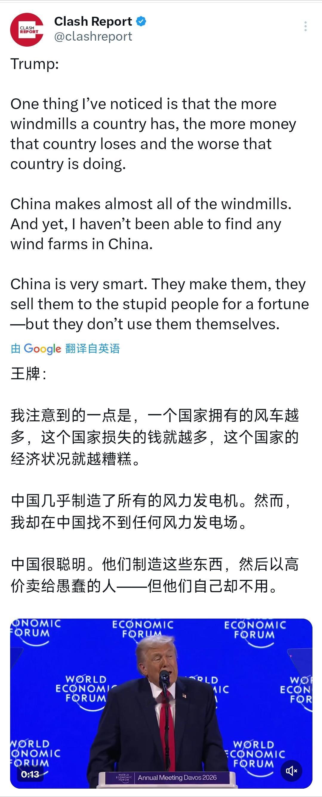 特朗普刚刚在达沃斯论坛上又胡说八道了。特朗普表示:“我注意到的一点是,一个国家拥有的风车越多,这个国家损失的钱就越多,这个国家的经济状况就越糟糕。中国几乎制造了所有的风力发电机。然而,我却在中国找不到任何风力发电场。中国很聪明。他们制造这些东西,然后以高价卖给愚蠢的人但他们自己却不用。” 这番言论一出,台下的欧洲政要脸都绿了,但最让人惊讶的,是他硬要把中国拉进来“背锅”。 特朗普信誓旦旦地说,中国制造了全世界所有的风车,但中国人自己从来不用,专门高价卖给“愚蠢的人”。 这逻辑简直就是“杀人诛心”,言下之意,谁买风车谁就是那个被收割的“傻瓜”,而欧洲显然是他眼里的头号冤大头。 但事实真的如此吗?如果真按特朗普说的,中国自己不用风电,那中国遍布沿海和西北戈壁的那些“白色森林”难道是摆设吗? 数据是不会撒谎的,截至2025年10月,中国风电装机容量已经连续15年稳居世界第一,这哪里是“不用”,简直是用到了极致。 累计并网容量达到5.8亿千瓦,这是什么概念?这意味着中国全社会每用10度电,就有1度是风吹出来的。 更讽刺的是,就在特朗普大放厥词的时候,中国的能源工作会议刚刚定下2026年的小目标:再干它2个亿千瓦。 中国不仅自己用,还把风电玩出了花,现在的风机都装上了AI大脑,搞起了“风储一体化”,发电效率比以前高了一大截。 特朗普说中国把风车卖给“愚蠢的人”,那中国自己作为全球最大的风电应用国,难道是“最大的傻瓜”吗? 显然,特朗普的这套逻辑,连最基本的自洽都做不到,他攻击的不是风电,而是全球能源转型的共识。 他之所以这么急赤白脸地攻击风电,背后还是那套“美国优先”的老算盘:保护传统的化石能源利益。 在他眼里,每一个转动的风车,都是在抢石油和天然气的生意,都是在削弱美国作为传统能源霸主的地位。 所以他必须把水搅浑,必须把清洁能源描绘成一个亏本的买卖,甚至不惜编造“中国自己不用”这种一眼假的谣言。 这种操作手法,像极了当年美国封锁光刻机时的套路:我不行,你也别想行;我不想搞,你也别想搞成。 欧洲这次是真的被伤透了心,他们一直把绿色能源当作经济复苏的救命稻草,结果被盟友指着鼻子骂“方向错了”。 特朗普甚至直言不讳地说,欧洲就是因为搞了太多绿色能源,经济才变得一团糟,这简直是在欧洲的伤口上撒盐。 但达沃斯的科学家和商界领袖们可不买账,他们心里清楚:现在的风电成本早就低于火电了。 如果真像特朗普说的“每转一圈亏1000美元”,那全球的能源巨头早就破产了,资本是最聪明的,他们会做赔本买卖吗? 看着中国在新能源领域一路狂飙,从制造到应用全方位领跑,美国心里估计酸得很。为了找回面子,特朗普甚至在演讲中硬扯到了格陵兰岛,说为了美国的安全,还是想要那块地。 虽然他找补说“不会动武”,美股也因此涨了一波,但这恰恰暴露了他把地缘政治当生意做的本质。 在他看来,无论是买岛还是骂风车,都是为了维护美国那个所谓的“全球经济引擎”的地位。但他忘了,引擎是需要燃料的,而未来的燃料,注定不再是黑色的石油,而是绿色的风和光。 当美国还在计算风车转一圈亏多少钱的时候,中国已经把风电做成了全球最赚钱、最具有竞争力的产业之一。这不仅是技术的胜利,更是战略眼光的胜利。
