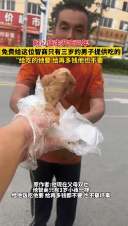 湖北枣阳,一男子的智商只有三岁,因为父母都已去世,男子只能捡垃圾为生!一好心店主看到后,觉得他可怜,就打算给点钱,谁料就是给再多男子也不要,就只要吃的!于是店主就每天免费给男子食物,一坚持就是三年,每次看到男子收下食物,店主都会笑得合不拢嘴! 人来人往的枣阳街头,那个总蹲在小吃店门口的男人,慢慢成了附近街坊都眼熟的人。他看着三十出头,个头不算高,脸上总沾着些灰尘,神情木木的,不太爱跟人说话。 他不像别的流浪者那样会伸手求助,每天只是安静地蹲在角落,手里要么攥着捡来的塑料瓶,要么捏着皱巴巴的破布,一双眼睛直直盯着店里冒着热气的锅灶。 那眼神里没有半分贪婪,只有纯粹的渴望,却又始终怯生生的,不肯往前多走一步。路过的行人有的会皱眉绕行,有的会低声议论几句,可他始终沉默着,活在自己的小世界里。 这份沉默,让路过的人心里都隐隐发酸,却很少有人真正停下脚步,问问他的情况。 小吃店老板第一次注意到他,是个格外炎热的中午。太阳晒得柏油路面都发烫,街上的人都急着躲进阴凉地,唯独他还蹲在店门口,身上裹着一件不合时宜的旧棉衣,显得格外突兀。 老板当时正忙着翻炒锅里的菜,抬头瞥见他,没太在意,可等忙完一阵再看过去,发现他还在原地,眼神直直地落在食客桌上的饭菜上。 老板心里一软,把后厨剩下的一份饭菜装进干净的饭盒,放在了店门口的台阶上。男人迟疑了好一会儿,才慢慢挪过来,蹲下身小心翼翼地拿起饭盒,转身躲到旁边的树荫下。 他吃得很慢,小口小口地扒着饭,没有狼吞虎咽,也没有浪费一粒米,像是在对待什么无比珍贵的宝贝。看着他认真吃饭的样子,老板心里忽然涌起一股说不出的滋味。 从那天起,老板的灶台上每天都会多煮一份饭菜。他没声张,也没跟街坊邻居炫耀,只是在饭点时,悄悄把饭盒放在那个固定的角落。 男人像是摸准了时间,每天都会准时出现,拿起饭盒就躲到树荫下吃,从不多拿,也从不吵闹,吃完就默默离开,继续去捡那些散落的塑料瓶。 日子一天天过,街坊们也渐渐发现了这个不成文的约定。大家看他的眼神从最初的好奇,慢慢变成了心疼,有人从家里拿来旧衣服,有人送来几双厚实的袜子,他从不拒绝,也不会说谢谢,只是默默收下。 每次吃饱饭,他都会露出一个特别干净的笑容,那笑容像极了吃到糖的孩子,纯粹又满足,看得人心里暖洋洋的。 这份默契,一坚持就是三年。春去秋来,街边的店铺换了好几家招牌,男人每天准时出现的身影,却成了小吃店门口最固定的风景。 老板也慢慢摸清了他的喜好,天冷的时候,就多煮一碗热乎乎的汤面,天热了,就换成清爽的凉面和稀饭,不是为了别的,就是发自内心地想让他吃得舒服一点。 有一回下大雨,街上几乎看不到行人,老板一早打开店门,心里还琢磨着,这么大的雨,他今天应该不会来了。 可没过多久,就看到一个披着塑料布的身影,从街角慢慢挪了过来。男人全身都湿透了,头发贴在脸上,脚步却稳稳的,一步一步走到熟悉的角落,安静地等着那份热饭。 老板赶紧把刚煮好的姜汤面递过去,男人接过饭盒,抬头露出了那个熟悉的笑容。那一刻,老板忽然觉得,自己的这份坚持,早就成了男人生活里不可或缺的一部分。 后来有个路人偶然拍下了他吃饭的画面,照片里的男人坐在树荫下,一手端着饭盒,一手慢慢扒饭,眼神专注又宁静。 这张没有滤镜、没有背景音乐的照片被发到网上后,一下子打动了无数网友。越来越多的人知道了枣阳这家小吃店的故事,有人专门绕路来店里消费,有人送来米面油表达支持。 面对大家的夸赞,老板只是笑着摆摆手,他说:“一个人吃饭其实不难,难的是有人愿意每天记得,他有没有吃上一口热乎饭。” 如今,男人依旧每天准时出现在小吃店门口,依旧沉默寡言,只是接过饭盒时,偶尔会对着老板点点头。 这份没有太多言语的默契,成了枣阳街头最温暖的风景线,也让大家看到,平凡人的善意,原来也能有这么大的力量。