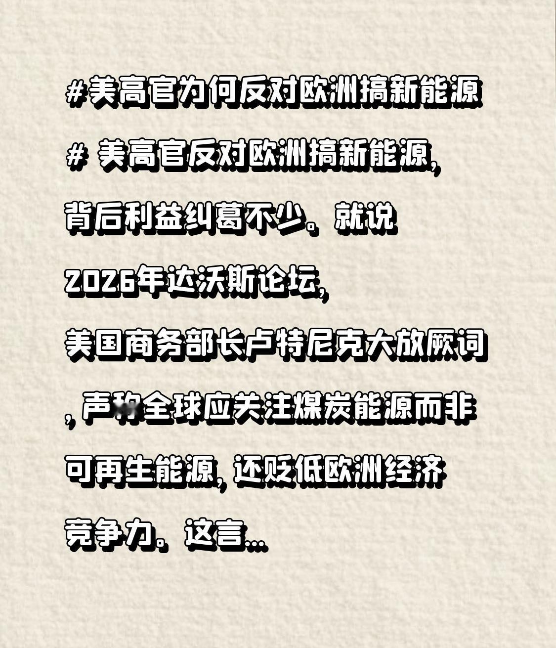 美高官反对欧洲搞新能源,背后利益纠葛不少。就说2026年达沃斯论坛,美国商务部长卢特尼克大放厥词,声称全球应关注煤炭能源而非可再生能源,还贬低欧洲经济竞争力。这言论一出,现场嘘声一片,连欧洲央行行长都直接离场。 此前特朗普也抨击欧洲发展方向不对,还觊觎格陵兰岛。美国在能源上有自己的算盘,传统能源产业在美国势力庞大,新能源发展可能冲击其利益。而且美国想在能源领域保持主导,欧洲大力搞新能源会威胁其地位,这或许就是美高官反对欧洲搞新能源的重要原因。