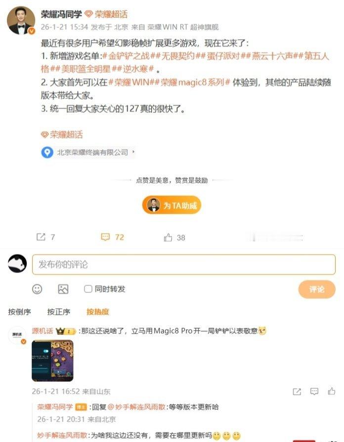 【荣耀「幻影稳帧」功能新增游戏公布,含《金铲铲之战》《第五人格》等】荣耀游戏研发工程师 冯同学 发文公布了「幻影稳帧」新增游戏,包括:《金铲铲之战》《无畏契约》《蛋仔派对》《燕云十六声》《第五人格》《美职篮全明星》《逆水寒》荣耀游戏研发工程师 冯同学 表示,「幻影稳帧」新增游戏可以首先在荣耀 WIN 系列和荣耀 Magic8 系列手机上体验到,其他产品陆续随版本更新支持。荣耀 GT 手机(2024 年 12 月发布)首发自研幻影引擎,号称支持「重载游戏 0 抖动」、「贴膜场景 0 断触」、「功耗优化 0 容忍」特性。该功能首批支持游戏包括:《王者荣耀》《原神》《崩坏:星穹铁道》《绝区零》《鸣潮》《永劫无间》《和平精英》《穿越火线》《三角洲行动》《英雄联盟》《火影忍者》《QQ 飞车》。