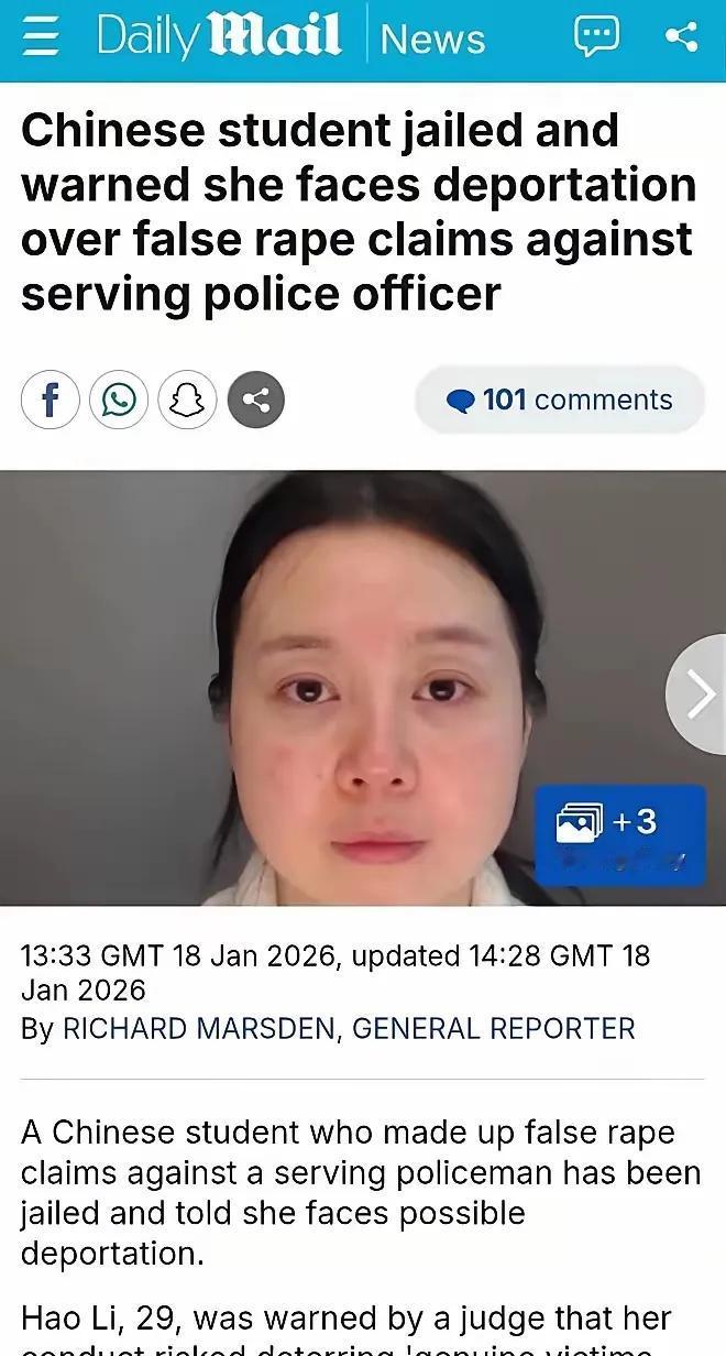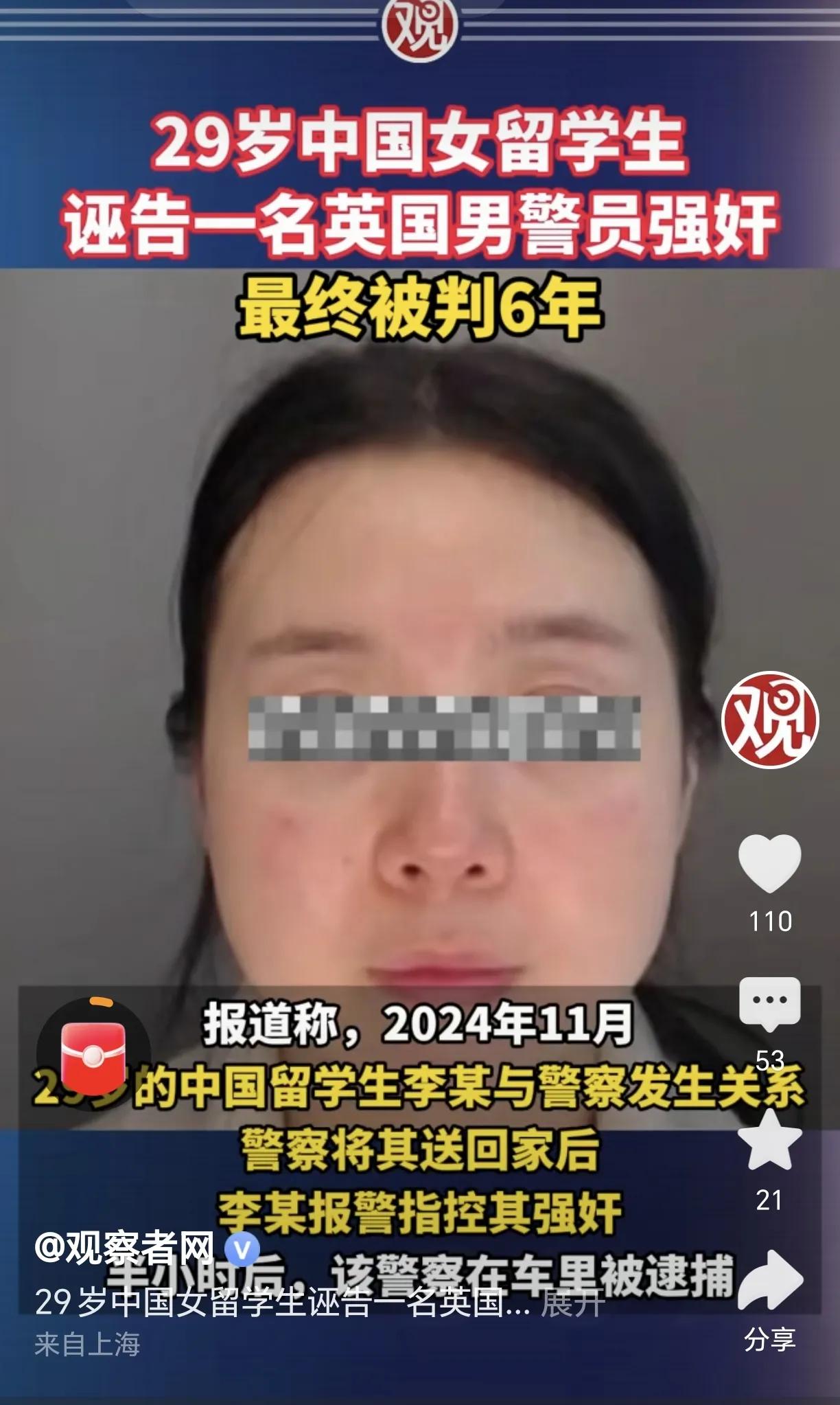 中国女留学生诬告男警察强奸,现被判刑6年。 看到这个面相的时候,不由得和其他网友一样联想到了傅首尔,古代面相学原来是经验积累的概率学。 真需要对这类强奸诬告案件重判,才能切实保护受害者及真的被强奸者。 强奸控告 女留学生诬告英国男警员强奸被判刑