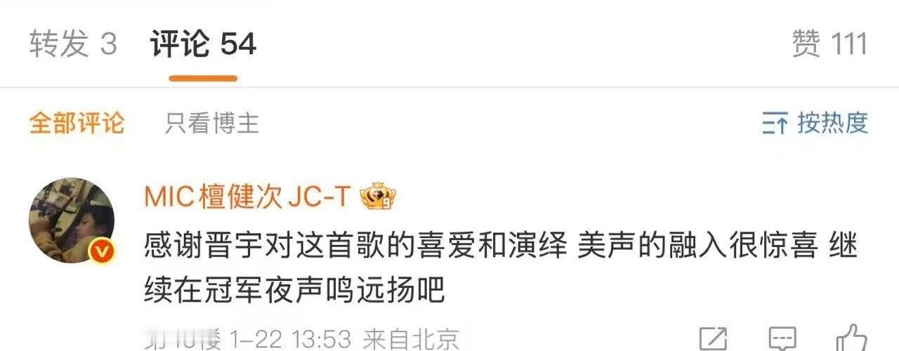 檀健次给危晋宇冠军夜加油檀健次评价危晋宇的蒙娜丽莎舞台:感谢晋宇对这首歌的喜爱和演绎,美声的融入很惊喜,继续在冠军夜声鸣远扬吧!惺惺相惜的音乐人真的很暖心,比赛加油声鸣远扬