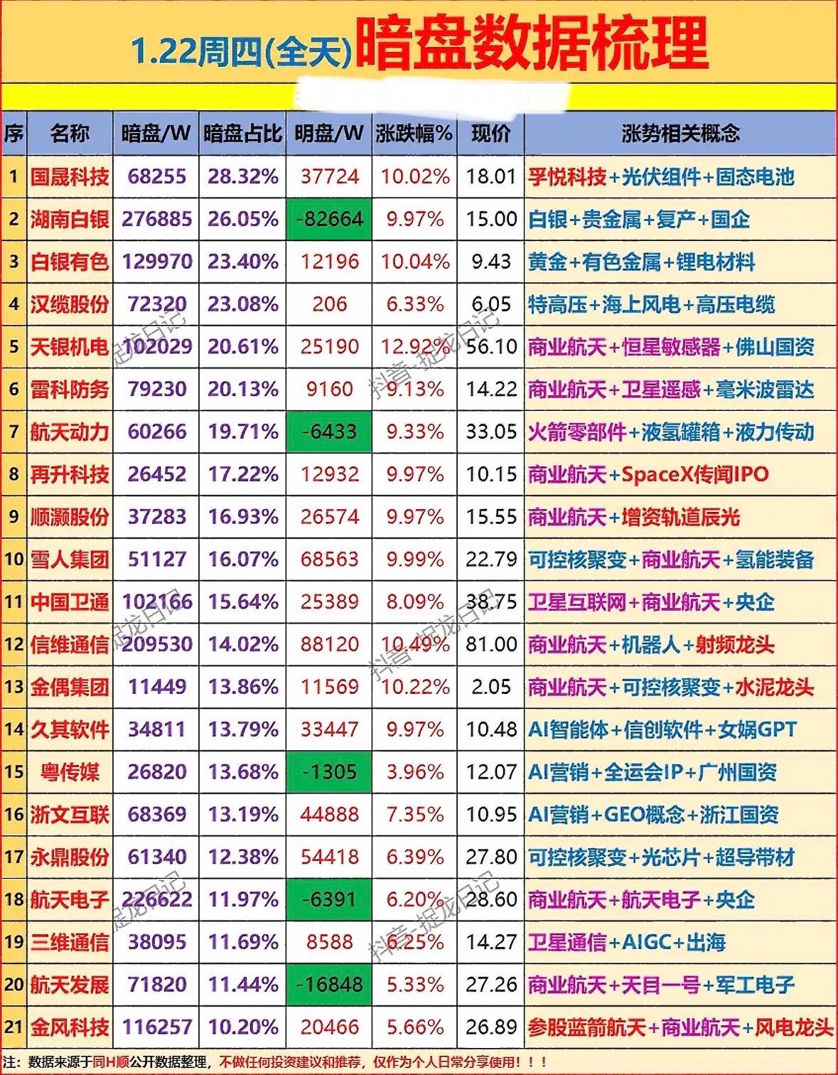 1月22日星期四收盘主力资金暗盘净流入个股梳理 "商业航天与新能源板块领涨,白银有色、风电龙头表现亮眼,数据仅供参考非投资建议。"