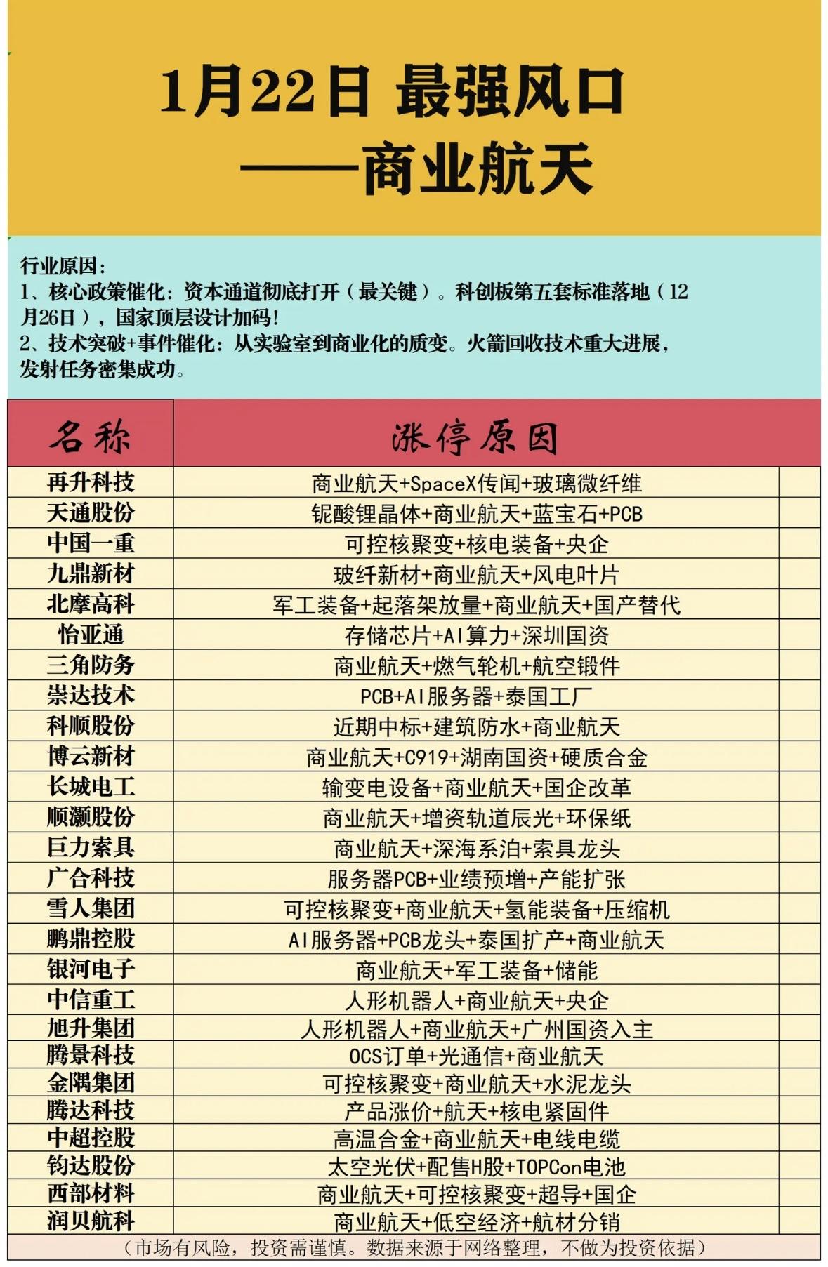 1月22日今日最强板块商业航天 "商业航天迎政策技术双驱动,多领域龙头布局太空经济新 商业航天迎政策技术双驱动,多领域龙头股集体爆发,涉及军工、新材料、新能源等赛道,市场热度高涨但需理性投资。
