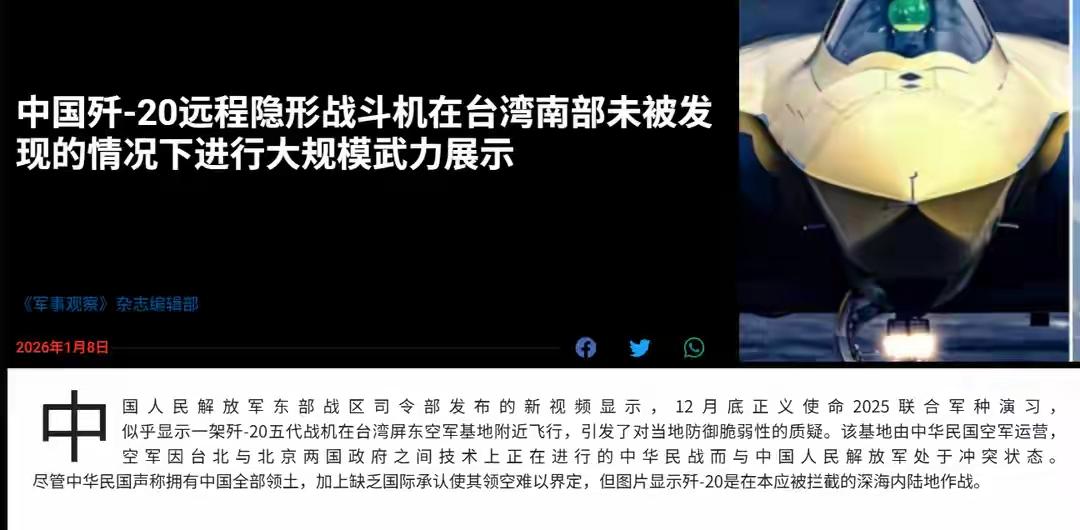 【歼20飞越台岛,台军雷达为何全程沉默?】近日,东部战区在台海方向的演习引发关注。央视发布的纪录片中,有歼-20飞行员直言“忘不了驾驶歼-20看到宝岛时的情景”。这证实了歼-20已能飞临台岛,目视距离近在咫尺。 然而,面对歼-20的抵近,台军防空系统似乎“视而不见”。在历次台防务部门的通报中,歼-20的踪迹几乎从未出现。台军前空军副司令张延廷指出,台军现有雷达难以侦测歼-20这类隐身战机。其装备的“爱国者”防空系统雷达架构老旧,本就不为探测隐身目标设计。有分析认为,台军雷达在演习期间可能“快转冒烟了”,但屏幕上仍看不到歼-20。 这种“看不见”的背后,是技术的绝对代差。歼-20不仅能自身隐身,还能在体系支撑下,让台军雷达对其护航机群也“失明”。退役台军少将曾发出连串质问:歼-20是否已飞入本岛上空?是台军不敢报,还是根本看不见? 答案不言而喻。 面对绝对的力量优势,任何虚张声势都显得苍白。当最先进的战机已能在家门口自由巡航,某些人鼓吹的“以武拒统”不过是一场幻梦。 老铁们,你们觉得台军是真没发现,还是发现了不敢说?对于咱们国家空军实力的这种进步,你有什么感受?(图源:网络截图)东部战区 联合利剑演习 隐身战机 台海局势 解放军巡台