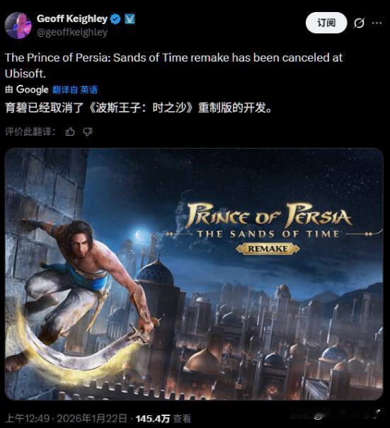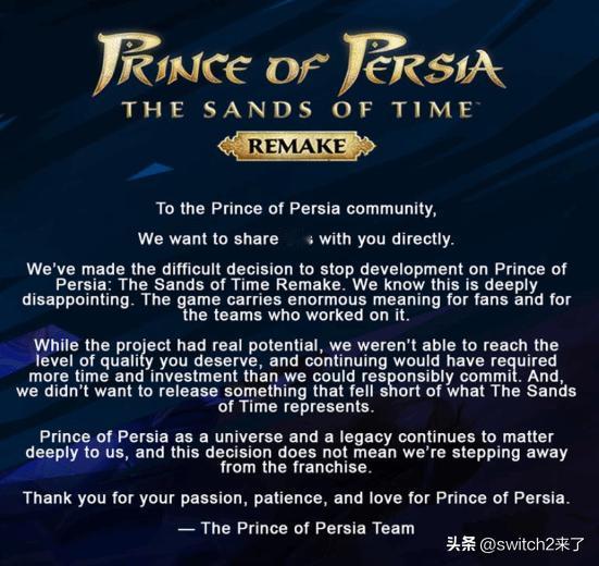 TGA创始人Geoff Keighley突然在推特发文宣布,育碧旗下已开发多年的《波斯王子:时之砂 重制版》现已被取消! 随后,《波斯王子》官方账号发布了正式公告,确认该项目的开发工作现已停止。“我们深知这会让玩家们深感失望。尽管该项目具备真正的潜力,但目前的开发内容未能达到您所期望的质量水平。继续推进该项目所需要的时间和投入已经超出了我们所能承担的极限。此外,我们也不愿意推出一款未能充分展现《时之砂》精髓的作品。”