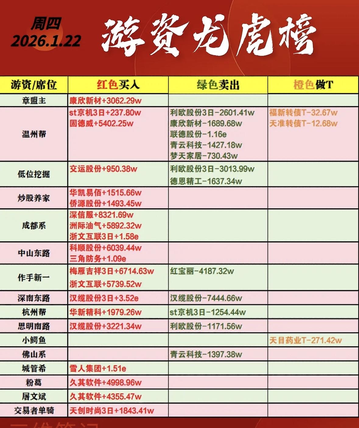 2026年1月22日游资龙虎榜分析:红色买入、绿色卖出、橙色做T 游资动向:章盟主重仓买入,温州帮大额卖出,低位挖掘调仓换股,各路资金博弈激烈,市场分歧明显。