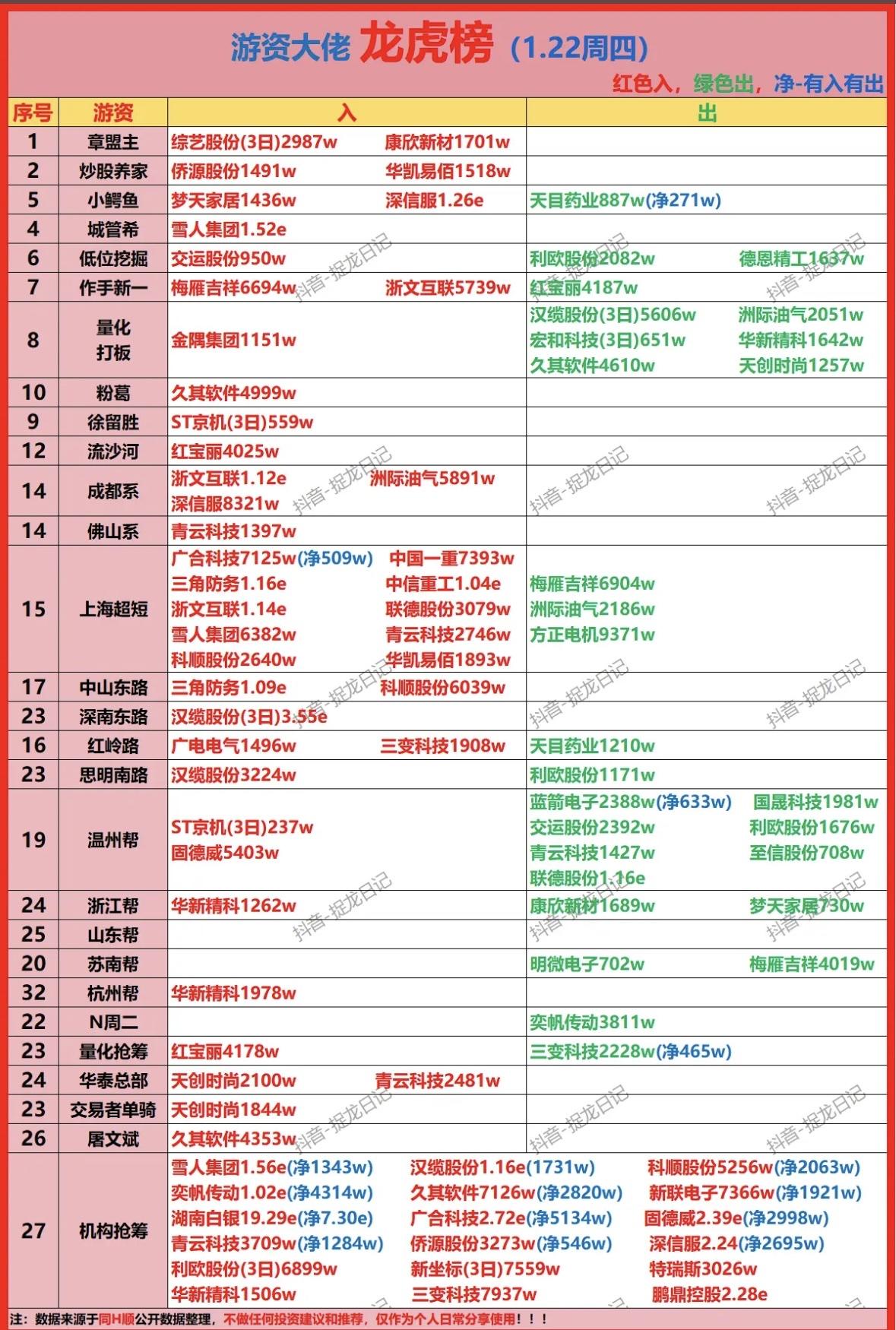 1月22日龙虎榜周四大盘点:游资大佬动向一览 游资龙虎榜揭秘:大佬布局热门股,量化打板活跃,机构抢筹暗流涌动。