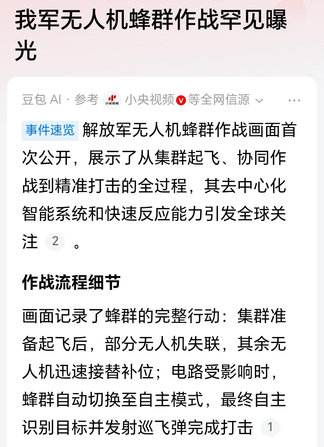以后的战场规则可能要由我们来制定了,李云龙从来都没有打过这么富裕的仗 最近咱们的无人机“蜂群”作战画面曝光。 这玩意儿在俄乌战场可是出了大风头——想想看,漫天小飞机像蝗虫过境一样扑过去,什么防空系统都得头皮发麻,简直是把“便宜量又足”发挥成了一种战术美学。 说到这儿就不得不提咱家的绝对优势:全球每10台无人机里超过7台贴着“中国制造”,这产能相当于掌握了未来战场的“无人机制造权”。更关键的是,我们的无人机不仅能量产,还能“智产”——集群自个儿能组网、能商量战术,跟有了集体意识似的。 想象一下,未来战场可能是这样的:咱们这边成千上万架智能小飞机,成本低到对手摔了心疼、不摔头疼;它们在空中自己协调,像会飞的狼群一样专挑要害下手。 这哪里还是单纯的武器比拼,根本是咱们的完整产业链和AI技术,在给战争规则重新“编程”。以后说起“蜂群战术”,搞不好就像今天说“闪电战”一样,代表着一个新时代的作战方式——而我们,正在成为那个定义规则的人。 点右上角关注我,我们一起去看这个魔幻的世界