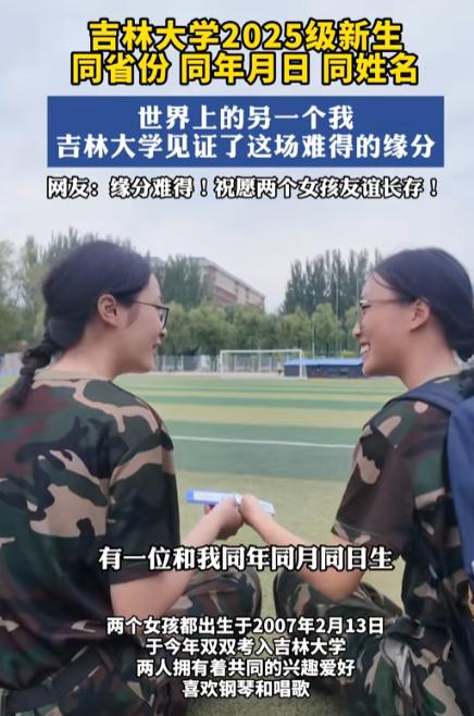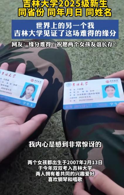 [微风]“太神奇了!”吉林,两名大一新生在军训时,意外发现有另一个女孩,和自己同名同姓、同年同月同日生,甚至还同省、同校、同级!还都戴着眼镜,穿着同样的军训服。网友:两人甚至用同一张脸! 这缘分真是绝了,我看连老天爷估计都得惊掉下巴!就在吉林一所大学的新生军训操场上,发生了这么一档子稀奇事儿:两个女孩大眼瞪小眼地对视了三秒钟,紧接着全都傻眼了,为啥呢? 据新派新闻2025年9月10日报道,两个女生不但连名带姓都叫王韵涵,甚至连生日都是同年同月同日生,更绝的是,老家居然还都是山东的! 这一下子,旁边的学长直接看愣了神,家长手里的手机都差点吓得掉地上,但这奇遇还没完呢,精彩的还在后头。 俩新生赶紧掏出身份证件凑一块儿仔细比对,好家伙,籍贯那栏里明明白白都写着“山东省”。 虽说具体的家乡一个在鲁东头,一个在鲁西边,但这缘分已经够难得了。 更让人啧啧称奇的是,这俩姑娘长得也太像了:都留着乖巧的齐肩短发,鼻梁上都架着同款的细黑边眼镜,再裹上那一身一模一样的迷彩军训服,往那一站,旁边的同学直接懵圈:“这莫非是复制粘贴出来的吧?” 说句大实话,这种事儿发生的概率,恐怕比买彩票中头奖还要难。 咱们细细算笔账:在全国这么多人里,重名重姓的情况确实不少见,可要是卡死在2007年2月13日这一天同年同月同日生,那几率立马就掉到了三万分之一。 要是再把同是山东省,考上同一所高校,同一个年级,甚至在2025年新生军训休息的时候正好并肩坐在一起这些条件全叠加上,这简直就是百万分之一的绝世好运! 网上的舆论瞬间就炸锅了,有人开玩笑调侃:“建议赶紧去查查当年医院是不是抱错孩子了。” 就连这两位当事人自己,都觉得这一切太不可思议了。 军训歇着的时候两人凑一块儿唠嗑,这一聊更是让人起了一身鸡皮疙瘩。 其中一个说自己特别喜欢弹琴唱歌,另一个立马表示虽说没受过专业训练,但心里也一直向往这事儿。 甚至在一些生活习惯和性格脾气上,两人都出奇地合拍。 这哪里仅仅是巧合啊,分明就像是命运之手早就写好了剧本一样。 不过,最让人觉得舒适的,还是这两位姑娘面对这奇遇时的态度。 现场并没有出现那种尖叫连连或者抱头痛哭的狗血场面,她们只是特别淡定又惊喜地笑着说:“那以后咱俩就是亲姐妹了呗。” 这份波澜不惊的从容劲儿,反倒让围观的网友觉得更神奇了,没准在哪个平行宇宙里,她俩早就已经是认识了一百年的老朋友了。 甚至有脑洞大开的人,都已经给编出了一部叫《寻找另一个我》的电影大纲。 随着这事儿热度越来越高,评论区里的讨论也越来越精彩。 不少山东IP的网友跑来“认亲”:“快说说你们到底是鲁东还是鲁西的?”也有人现身说法,讲自己以前就遇见过同名同姓的邻居,最后两家人处得跟一家人似的往事。 更有围观的感慨:“这年头找对象都没这缘分,建议两人以后互相当伴娘算了。”最让人笑喷的是,还有网友直接喊话学校:“赶紧给她们俩分到一个宿舍去,这热度不蹭白不蹭!” 归根结底,为啥这种稀奇事总能一下子戳中大伙的兴奋点呢? 或许是因为平时平淡如水的日子过久了,偶尔出现这么一桩离奇的巧合,就像在苍白的生活画布上抹了一笔亮色。 它好像在暗示咱们,这个世界依然藏着无限的未知,或许就在下一个路口,你我也能撞见那个跟自己如同“复制粘贴”一样的另一个人,或者碰上一段足以改写人生轨迹的奇妙缘分。