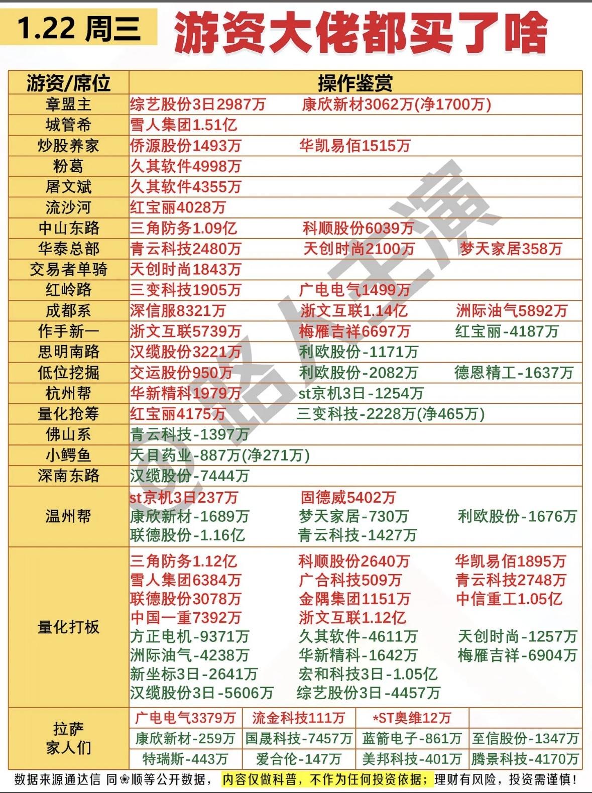 揭秘1.22周三游资大动作,谁在买入谁在卖出? 游资动向:章盟主、炒股养家等大佬活跃,多股获大额买卖,市场博弈激烈,投资需谨慎。