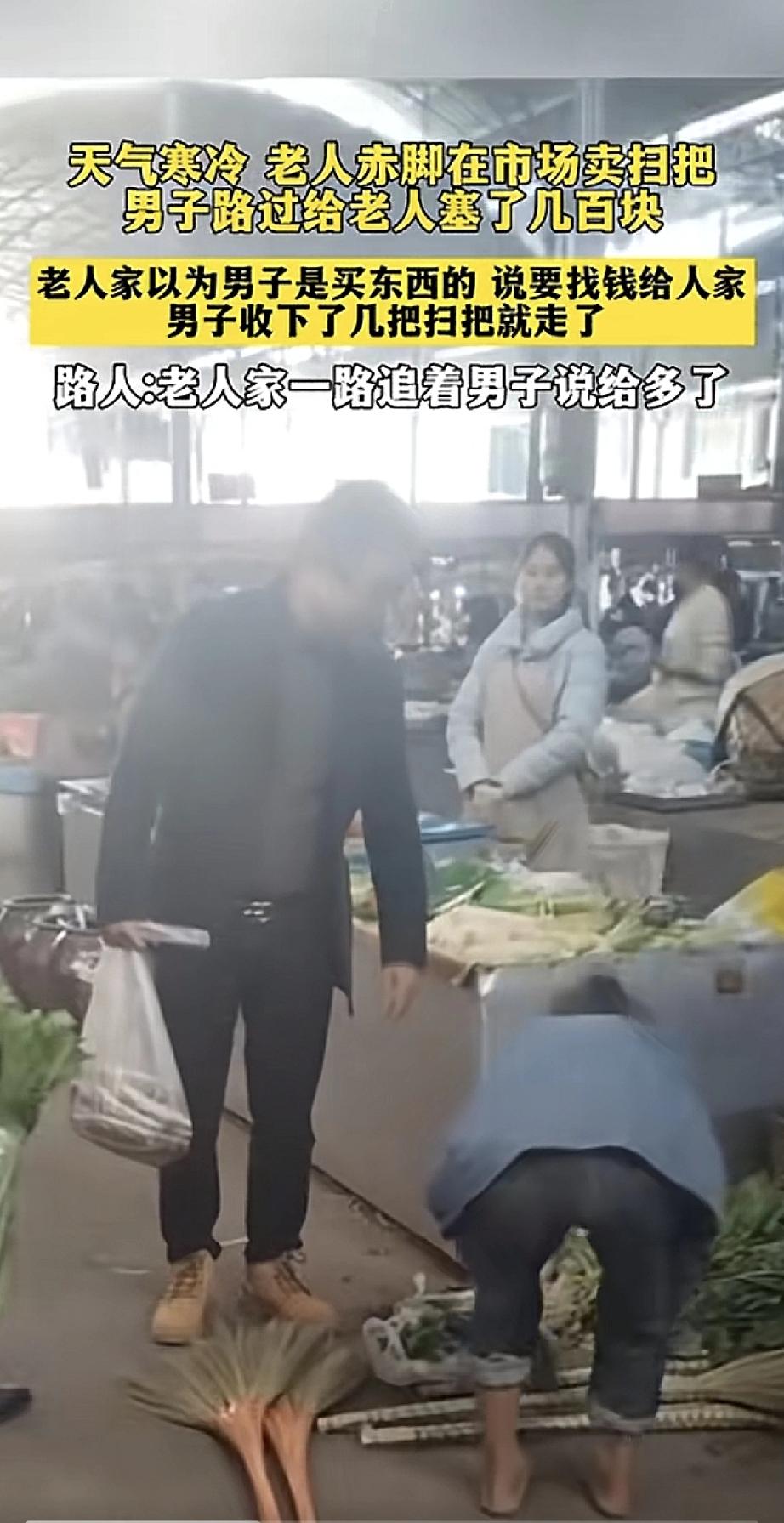 天寒地冻的,一位老奶奶光着脚,在菜市场门口卖自己扎的扫把。看着就让人心疼。 这时,一位路过的大哥停了下来。他没多说什么,掏出几百块钱,直接塞到老人手里。老人以为他要买扫把,连忙说钱给多了,要给他找零。 大哥摆摆手,只象征性地拿了两三把扫把,转身就走了。老奶奶心里过意不去,一路追着他说“给多了,给多了”…… 这一幕被路人拍下,看得人心里暖呼呼的。善良不用多言,两三扫把,几百块钱,传递的是寒冬里最朴实的温度。
