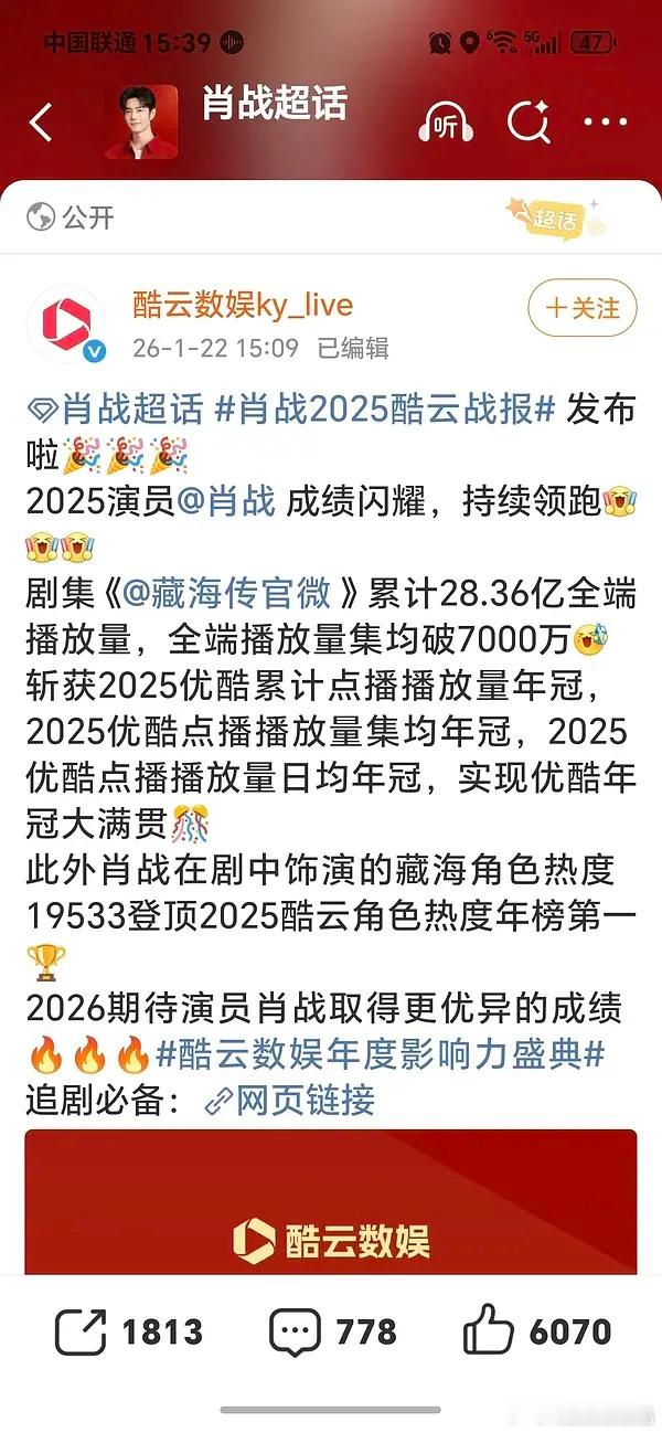 肖战2025酷云战报酷云又给肖战和藏海传发战报了!剧集《》累计28.36亿全端播放量,全端播放量集均破7000万斩获2025优酷累计点播播放量年冠,2025优酷点播播放量集均年冠,2025优酷点播播放量日均年冠,实现优酷年冠大满贯🎊此外肖战在剧中饰演的藏海角色热度19533登顶2025酷云角色热度年榜第一🏆2026期待演员肖战取得更优异的成绩🔥🔥 肖战藏海传酷云战报