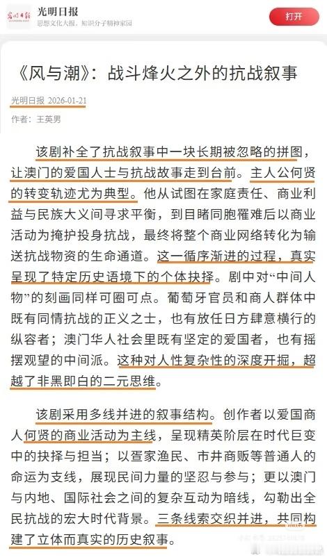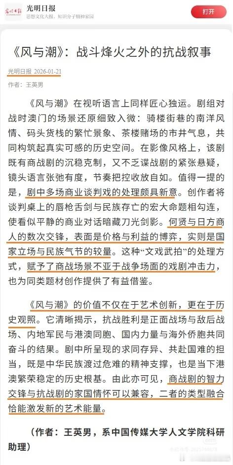光明日报也报道了电视剧风与潮 ,《风与潮》的价值不仅在于艺术创新,更在于历史观照。它清晰揭示,抗战胜利是正面战场与敌后战场、内地军民与港澳同胞、国内力量与海外侨胞共同奋斗的结果。剧中所呈现的求同存异、共赴国难的担当,既是中华民族渡过危难的精神支撑,也是当下港澳繁荣稳定的历史根基。由此亦可见,商战剧的智力交锋与抗战剧的家国情怀可以兼容,二者的类型融合恰能激发新的艺术能量。任嘉伦风与潮