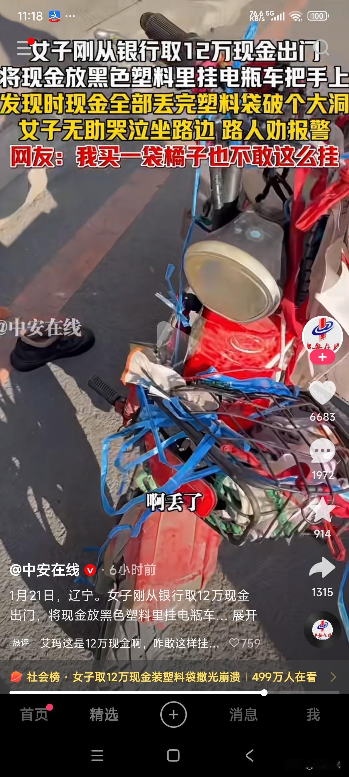 辽宁一女子刚从银行取12万现金出门,将现金装黑色塑料袋里顺便挂在了电瓶车把手上,发现时现金全部丢了塑料袋破个大洞,女子无助坐路边一边哭一边打电话。 这可真是太大意了,刚从银行取出来的12万一会时间就全部丢了,这到底是塑料袋子质量太差自己破了?还是有人看见她把钱装进塑料袋里挂在了车把手上,所以才有了可乘之机,在她不注意的时候顺便把袋子割破拿走了钱,当她发现的时候钱已经不翼而飞了,无助的只能坐在路边哭泣,好心路人劝她赶紧报警。 网友说自己买一袋橘子都不敢挂在车把手上,她居然把12万现金挂在了车把手上,这女子究竟是人太实在了还是她天生就虎呢?希望她能找回丢失的12万块钱吧。