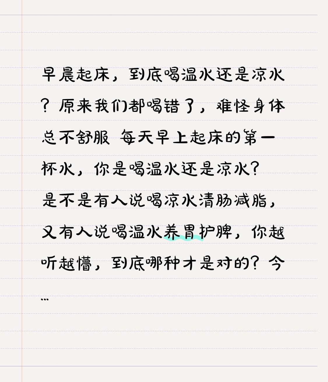 早晨起床,到底喝温水还是凉水?原来我们都喝错了,难怪身体总不舒服 每天早上起床的第一杯水,你是喝温水还是凉水?是不是有人说喝凉水清肠减脂,又有人说喝温水养胃护脾,你越听越懵,到底哪种才是对的?今天就把这事说透,都是接地气的大实话,没有虚头巴脑的专业术语,看完再也不用瞎纠结,喝对第一杯水,一天都舒服! 咱先说说为啥早上起床必须喝水?经过一晚上的睡眠,身体8小时没进水,呼吸、出汗、排尿早把水分耗光了,血液都变稠了,这时候喝杯水,就跟给干涸的土地浇了场雨,能快速唤醒身体,促进新陈代谢,这一步咱所有人都得做,关键就在于水温! 网上总有人吹,早上喝冰水、凉水能刺激肠胃蠕动,还能燃脂,听着挺香,可咱普通人的肠胃哪经得住这折腾?尤其是早上,肠胃刚从休眠中醒过来,还处于“温温的”状态,一杯凉水灌下去,瞬间刺激肠胃收缩,脾胃弱的人立马就反酸、胀气、拉肚子,长期喝凉水,宫寒、胃寒的毛病全找上门,年轻人可能当下没感觉,等上了年纪,各种肠胃问题全来报到,真不值当! 也有人说那我喝开水总没错吧?大错特错!刚烧开的热水温度太高,直接喝会烫伤食道黏膜,长期下来还会增加食道损伤的风险,而且高温水会刺激口腔和肠胃,反而影响水分的吸收,喝了跟没喝似的,纯属白忙活! 其实答案特别简单,既不是冰水凉水,也不是滚烫开水,而是35-40℃的温白开水!这个温度和人体体温接近,喝下去不烫嘴、不凉胃,肠胃能毫无负担地吸收,快速补充身体水分,稀释血液,唤醒肠道,不管是老人、小孩,还是脾胃弱的人,都能喝,这才是最适合咱普通人的晨起第一杯水,也是老祖宗传下来的养身小妙招! 还有人爱往水里加蜂蜜、柠檬、盐,说能更养生,其实完全没必要!早上肠胃空空的,加蜂蜜会增加糖分摄入,空腹喝柠檬水会刺激胃酸,喝淡盐水还会加重身体钠负担,尤其是高血压的朋友,千万别瞎加!纯纯的温白开水,就是晨起第一杯水的天花板,简单又有效! 朋友们,养生从来都不是搞复杂的花样,而是把最简单的小事做对!晨起一杯温白开水,看似不起眼,却藏着最朴素的养身道理,坚持一天两天可能没感觉,可坚持一年半载,你会发现自己的肠胃变好了,晨起的口干舌燥消失了,连整个人的精神状态都不一样了! 咱普通人过日子,不用追那些花里胡哨的养生方法,把喝水、吃饭、睡觉这些基础的事做好,就是对身体最好的负责。从今天开始,把晨起的凉水、开水换成温白开水,一杯水的小事,却能养出好身体,值得我们每个人坚持!愿我们都能从细节出发,好好爱自己,把小日子过得健健康康的!