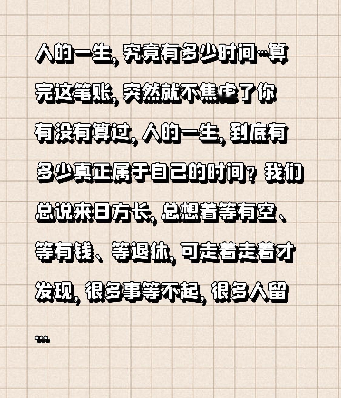 人的一生,究竟有多少时间…算完这笔账,突然就不焦虑了 你有没有算过,人的一生,到底有多少真正属于自己的时间?我们总说来日方长,总想着等有空、等有钱、等退休,可走着走着才发现,很多事等不起,很多人留不住,日子一眨眼就过去了,回头看全是遗憾。今天咱们就好好算笔时间账,看完你就会明白,这辈子最该珍惜的,从来都不是钱和名利,而是被我们随意挥霍的时光。 有人说人生百年,可真正能好好活、好好感受的日子,到底有多少?按平均寿命80岁算,一共29200天,除去前20年懵懂成长,后20年衰老体弱,真正能折腾、能陪伴、能创造的黄金时间,只剩40年,14600天。这一万多天里,我们每天睡8小时,去掉三分之一,只剩9733天;每天上班8小时,通勤、加班再占去一大半,真正能留给家人、留给自己、留给热爱的时间,寥寥无几。 我们总在忙碌中奔波,为了碎银几两熬着夜、拼着命,把最好的脾气留给外人,把最坏的情绪留给家人;把时间花在无意义的社交、刷不完的短视频上,却总说没时间陪父母吃饭,没时间陪孩子玩耍,没时间去完成自己想做的事。我们总以为时间很多,浪费一点没关系,可当父母的白发越来越多,孩子的成长转瞬即逝,自己的身体越来越差,才猛然惊醒:原来时间才是这世上最昂贵的东西,一旦弄丢,再也找不回来。 很多人活了大半辈子,都在为别人而活,为了世俗的期待拼命赚钱,为了别人的眼光勉强自己,却忘了自己想要什么,忘了生活的本意是什么。我们总在追逐遥不可及的远方,却忽略了眼前的风景;总在计较得失成败,却错过了身边的温暖。其实人生从来都不是一场赛跑,而是一场体验,别让忙碌辜负了时光,别让遗憾填满了余生。 朋友们,人的一生,看似漫长,实则短暂,掐指一算,真正属于我们的时间,真的没多少。别再等了,想去的地方就去,想爱的人就好好爱,想做的事就立刻去做,别让“等以后”变成“再也来不及”。 别再为了不值得的人和事消耗自己,别再把时间浪费在焦虑和迷茫里,好好生活,好好爱自己,珍惜眼前人,把握当下的每一分每一秒。因为这辈子,一旦过完,就再也没有重来的机会。愿我们都能把有限的时间,留给值得的人和事,活成自己喜欢的样子,让余生少一点遗憾,多一点温暖。