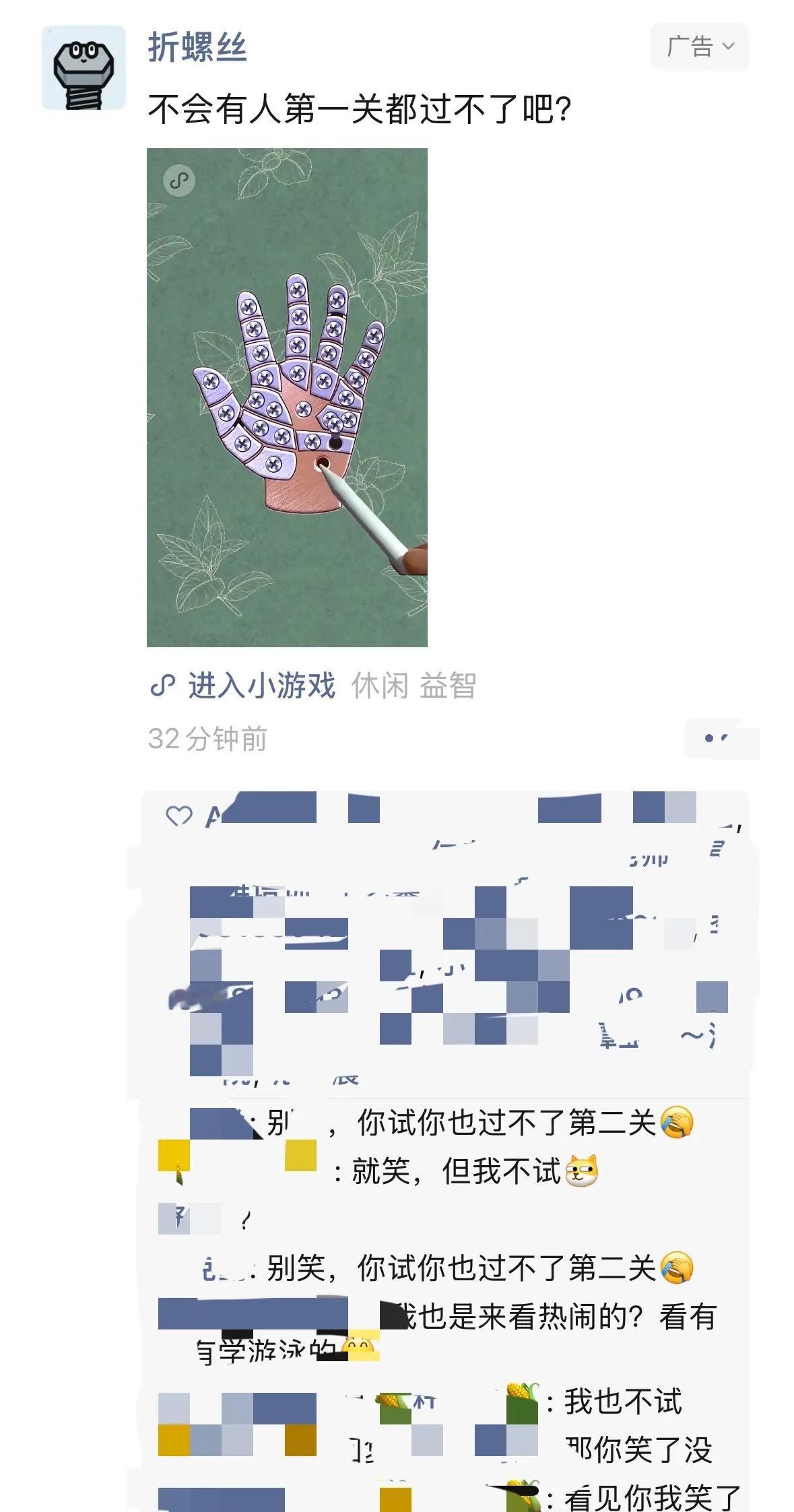 “别笑,我试你也过不了第二关。” “我就笑,我就不试……” 快被笑晕了,我还以为有这样一个人, 他和我有很多很多共同的微信好友了, 结果仔细一看, 竟然是一个广告, 很多好友在下面评论, 简单看了一下, 评论的一个比一个好玩, 还有的说着说着就变成了广告, 各种职业都出来了[捂脸] 快去看看你微信好友里面有这个广告没[笑哭]