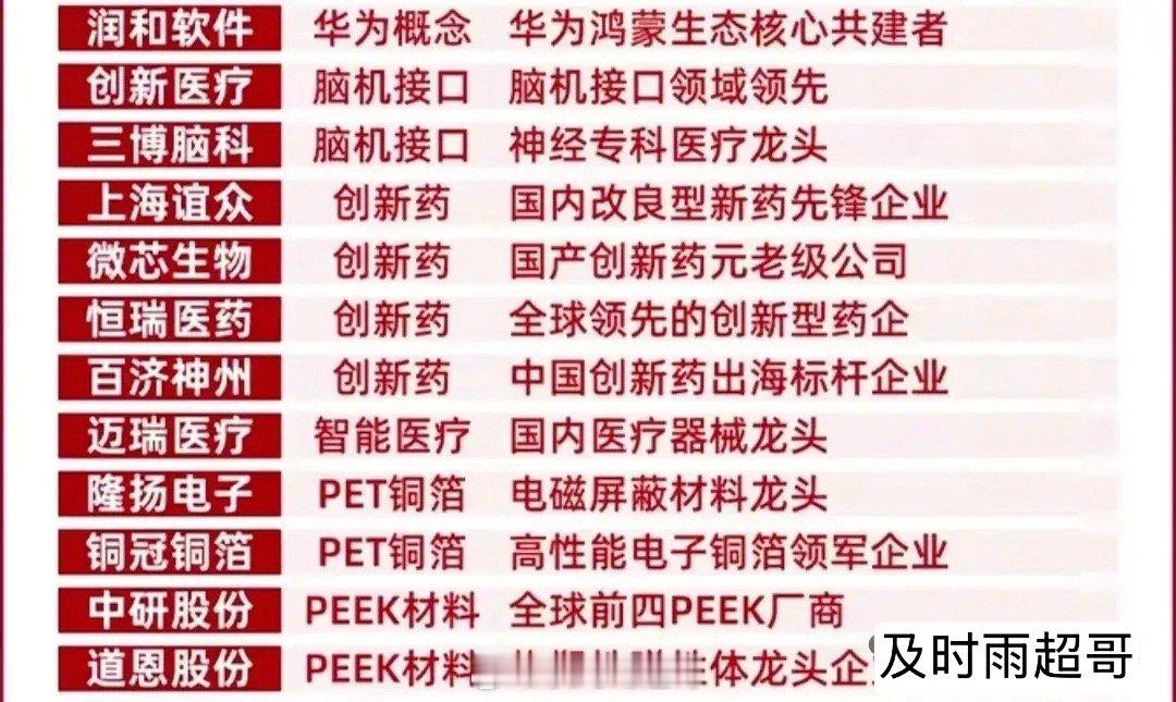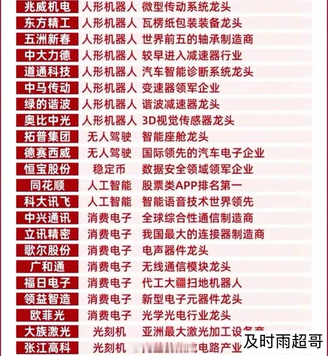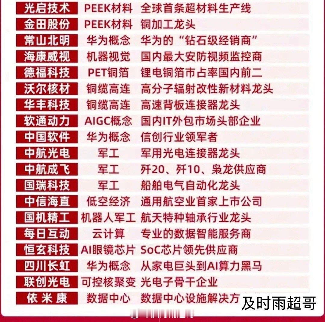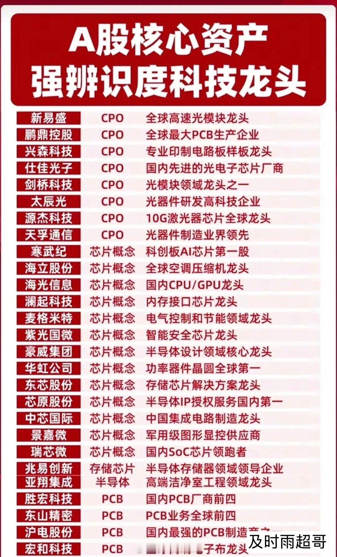 🚀 挖到宝了!这份硬核赛道龙头清单,看懂就赢在起跑线,收藏起来,随时对照,不错过主线行情中的关键机会。 从CPO、芯片概念到华为鸿蒙、脑机接口到创新药,从低空经济、可控核聚变到人形机器人,这份名单梳理了各硬核赛道的核心标的。既有技术壁垒深厚的细分龙头,也有具备全球竞争力的产业先锋,涵盖了AI算力、机器人、光刻机等当下最火的主线方向。科技龙头往往掌握着难以复制的核心技术或专利,在细分领域形成技术壁垒。具备全球竞争力的科技龙头,能够突破国内市场的局限,在海外市场获得增量空间。在拥抱科技龙头成长红利的同时,也不能忽视其背后隐藏的风险,做好风险预警才能走得更稳。理财有风险入市需谨慎,资料取材网络仅供参考不能作为投资依据。