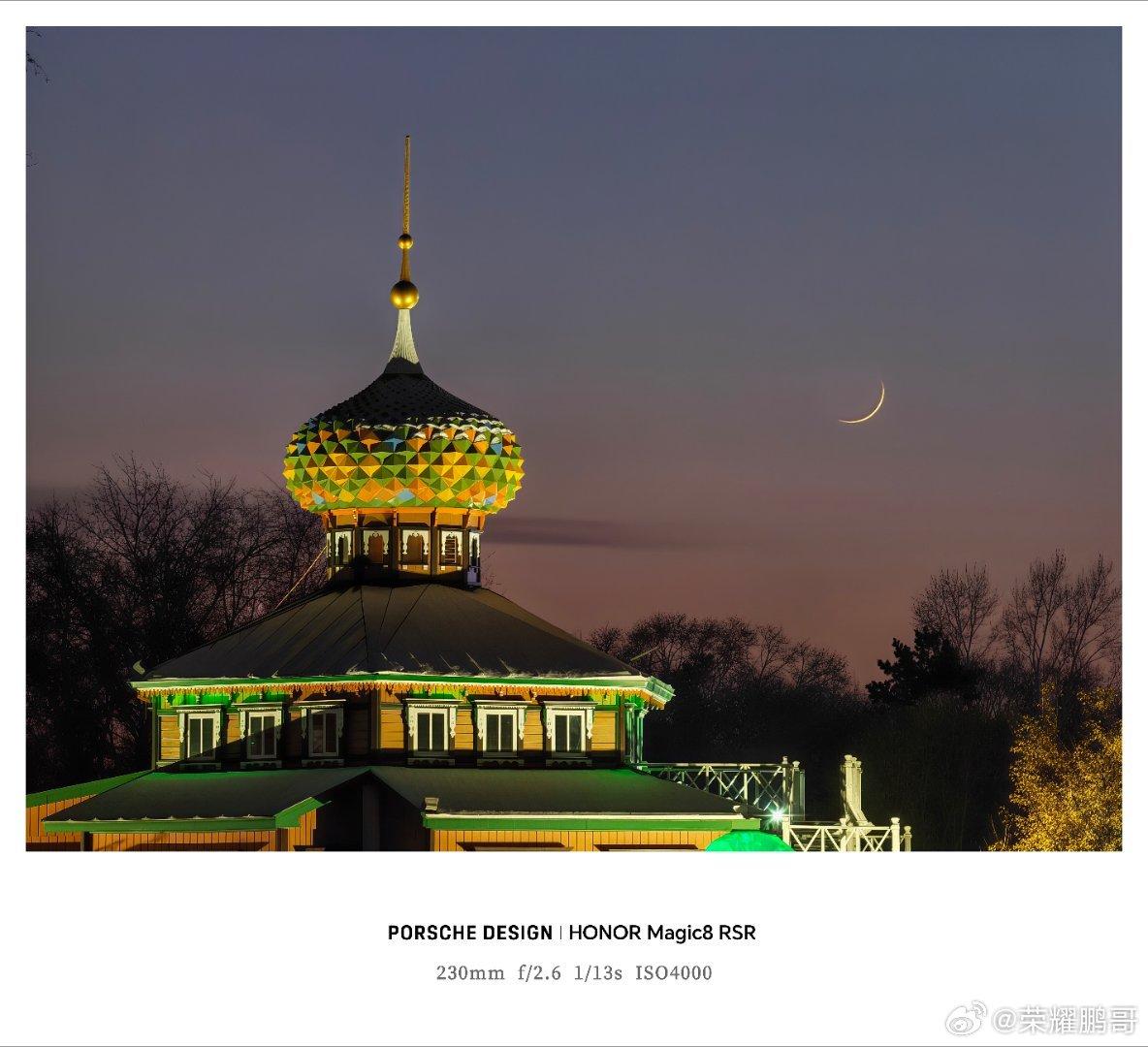 没想到荣耀Magic8 RSR保时捷设计,液晶随手拍的能力也是满优秀的,依托夜神影像的加持,夜晚复杂光纤的情况下,天空中的月亮和前景建筑物相得益彰,荣耀中国区电商部部长鹏哥,分享的这张利用这款机型拍摄的照片,整体效果蛮好 畅聊数码新品 数码资讯