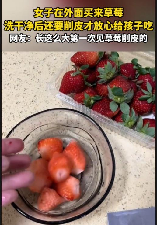 第一次见给草莓削皮的,真够奇葩的! 广东,一女子在外面买来草莓,怕打农药有污染,洗干净后还要削皮才放心给孩子吃。 如果打农药有污染,这么小果子早就被吸收进去了,就削那么层皮,有啥用?这样浪费食物,还不如不吃,最安全。 孩子照顾仔细没毛病,但是过于精细,就成温室里的花朵,经不起风吹雨打。 但是…… 你说女子不讲究,草莓洗干净还削皮。 你说女子讲究,后面案板发霉也没换。 当然,草莓是人家买的,孩子是人家自己的。人家想怎么吃就怎么吃,孩子想怎么养就怎么养,她开心就好。