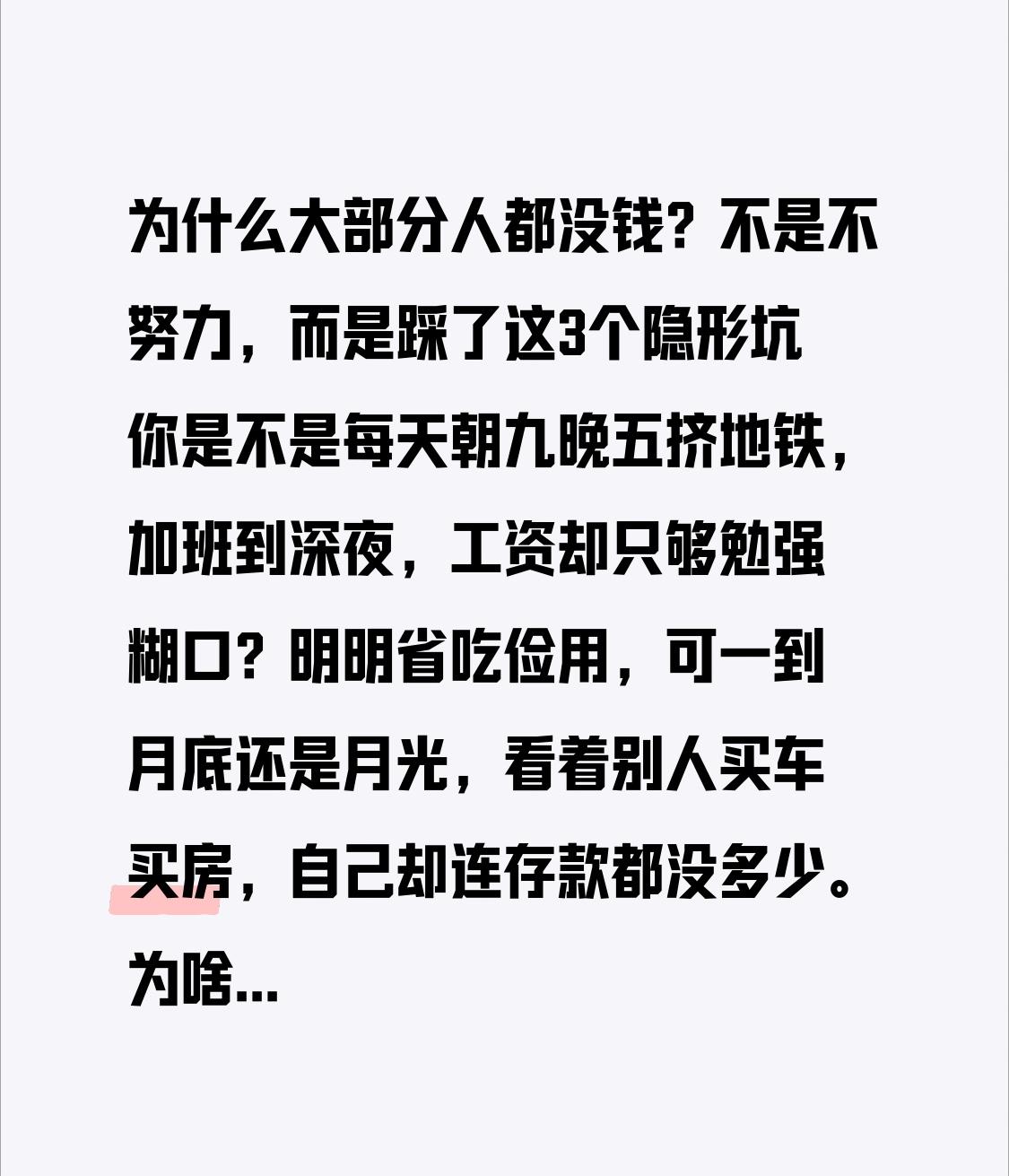 为什么大部分人都没钱?不是不努力,而是踩了这3个隐形坑 你是不是每天朝九晚五挤地铁,加班到深夜,工资却只够勉强糊口?明明省吃俭用,可一到月底还是月光,看着别人买车买房,自己却连存款都没多少。为啥大部分人明明很努力,却始终没钱?今天就拆穿背后的真相,不是你不够拼,而是踩了很多人都忽略的隐形坑,看懂少走5年弯路! 很多人都觉得,没钱就是因为赚得少,只要拼命加班、多打几份工,就能存下钱。可现实是,你工资从5000涨到8000,开支也跟着从3000涨到6000,最后存款还是没多少。这不是赚得不够,而是陷入了“消费陷阱”。商家总在鼓吹“精致生活”“及时行乐”,1000块的口红、2000块的球鞋、3000块的包包,看似不贵,可叠加起来就是一笔巨款。更可怕的是“超前消费”,信用卡、网贷随手就能借钱,花的时候没感觉,还款的时候才发现,工资的一半都用来还利息,越借越穷,陷入恶性循环。 但比消费陷阱更致命的,是“认知局限”。大部分人只知道靠死工资赚钱,觉得“稳定”才靠谱,却忘了工资的涨幅永远赶不上物价的上涨。我身边有个朋友,在国企上班,工资不高但稳定,他总说“没必要折腾”,结果工作5年,存款还不到5万。而另一个朋友,一边上班一边学理财,用闲钱买基金、学定投,3年下来,被动收入都快赶上工资了。很多人觉得“理财是有钱人的事”“投资风险太大”,可越是没钱,越要学会让钱生钱。那些真正有钱的人,早就跳出了“只靠工资”的思维,靠复利和被动收入,让财富滚雪球。 还有一个容易被忽略的点:“无效努力,消耗自我”。很多人看似忙得不可开交,其实做的都是重复劳动,没有任何成长。就像工厂里的流水线工人,每天工作12小时,可十年后还是只会做同样的事,工资涨幅微乎其微。而那些能赚到钱的人,都在偷偷提升自己的核心技能。比如程序员利用业余时间学新语言,设计师深耕某个细分领域,销售提升谈判技巧,这些“有效努力”能让你在行业里越来越值钱,收入自然水涨船高。无效努力只会让你越来越累,越来越穷,而有效成长才是赚钱的核心。 不过,没钱也不是不可改变。想跳出“越忙越穷”的怪圈,其实不难:先戒掉超前消费,每月强制存工资的20%,远离那些让你冲动消费的陷阱;再打破认知局限,花点时间学理财,哪怕只是简单的基金定投,也比把钱存银行强;最后聚焦核心技能,把时间花在能提升自己的事上,让自己变得“值钱”。记住,赚钱的本质,是价值交换,你能提供的价值越高,赚的钱就越多。 朋友们,大部分人没钱,从来不是因为不努力,而是因为消费无度、认知不足、努力无效。这个世界上,没有天生的穷人,只有安于现状、不愿改变的人。 别再抱怨赚钱难,也别再陷入无效努力的内耗。从今天开始,戒掉不必要的消费,提升自己的认知,深耕核心技能,慢慢积累,你会发现,赚钱其实没那么难。财富的积累需要时间,别着急,一步一个脚印,你想要的生活,岁月自会给你答案。愿我们都能跳出穷忙的怪圈,靠自己的努力,过上有钱有底气的日子!