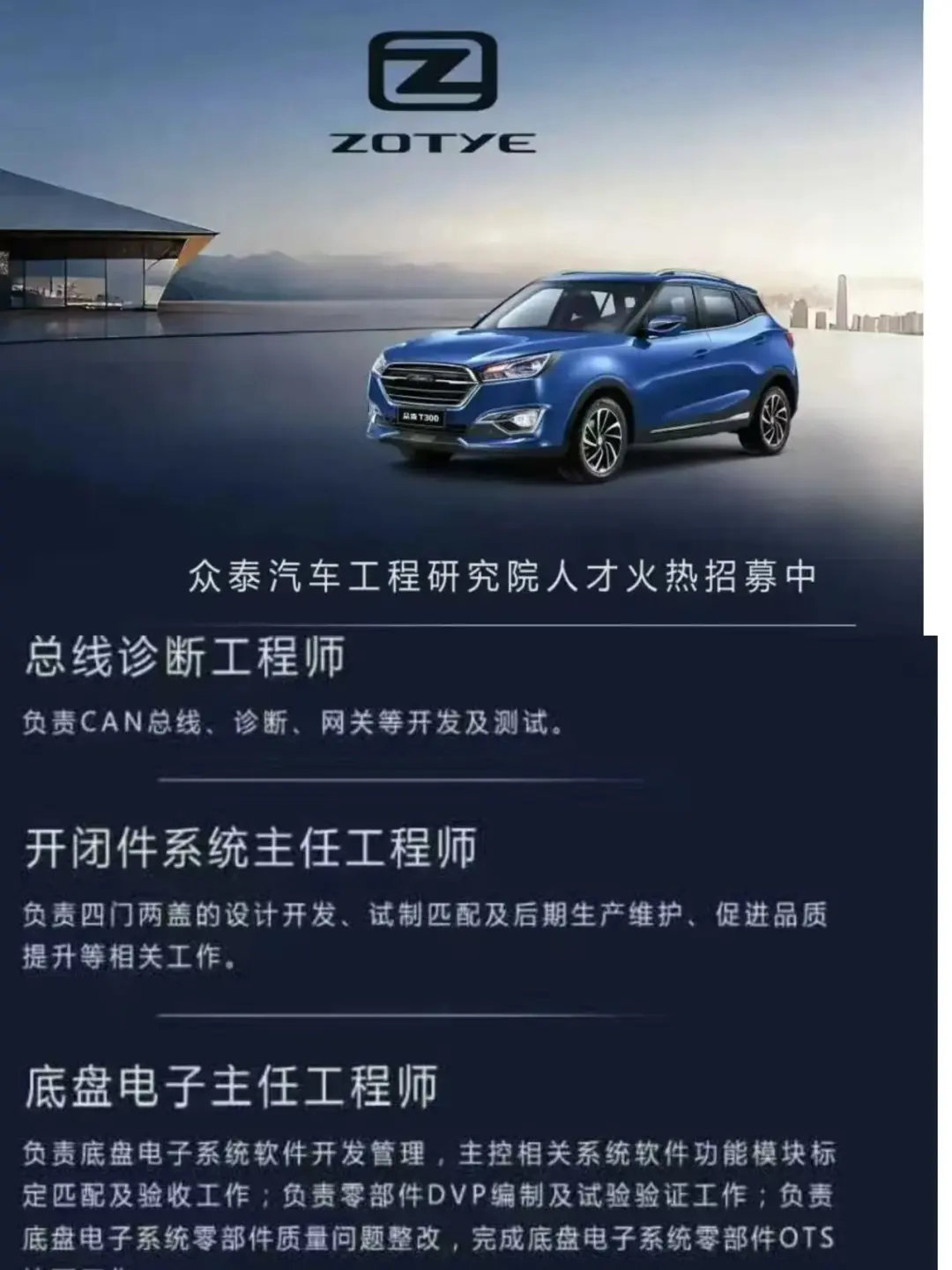 【众泰汽车启动大规模招聘】近日,一张众泰汽车(000980.SZ)招聘的海报在业内流传。据流传的海报显示,众泰汽车旗下工程研究院发布了一则“人才火热招募中”的大规模招聘信息,涉及总线诊断工程师、开闭件系统主任工程师、底盘电子主任工程师等超过20个核心技术领域,岗位覆盖新能源汽车研发的完整链条。据第一财经报道,1月22日,记者通过众泰汽车内部人士,确认了该招聘信息的真实性。上述人士告诉记者,自从招聘信息发出后,已经收到了不少的简历,平均每个岗位有5~6个符合岗位要求的应聘人员,目前已经有约20%的岗位已经有了意向人选。“目前来应聘的人员,最关心的两个问题,一是薪资情况,二是工作的稳定性。”他说,2025年已经有新的项目立项,涉及新能源车,此次招聘正是为了复工复产而做准备。猎聘的招聘动态显示,目前众泰集团正在招聘的岗位有49个,主要分布在金华和杭州两地。除了研发岗位外,还有法务、审计、成本、采购、证券事务专员等岗位。众泰汽车成立于1998年,总部位于浙江省金华市,2000年6月16日在深交所主板上市。2016年,众泰汽车的销量达到巅峰的33万辆,此后开始走下坡路,2019年销量仅2.1万辆,并陷入经营危机;此后,其资产多次被司法处置。2020年母公司铁牛集团破产引发连锁反应,众泰汽车同年被实施退市风险警示。Wind数据显示,自2019年以来,众泰汽车净利润已连续亏损7年。(界面新闻)