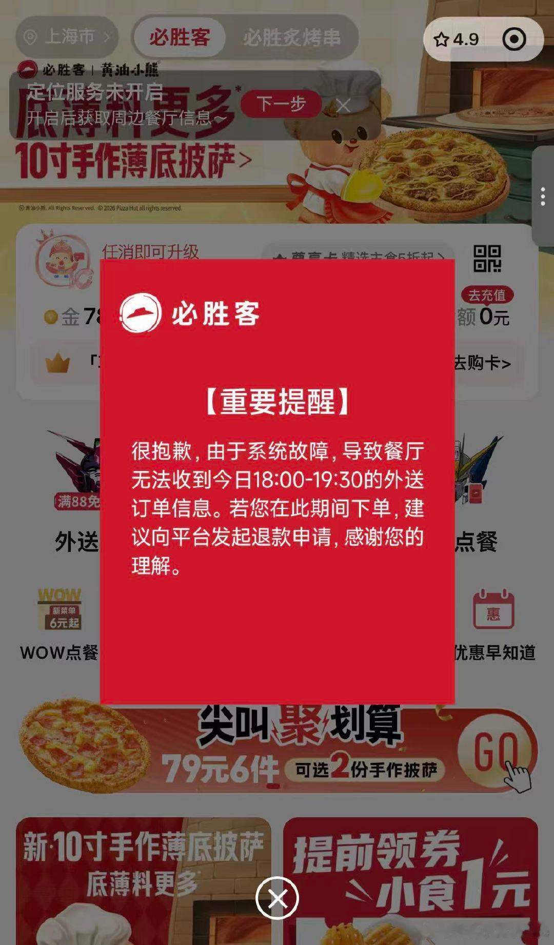 【必胜客道歉】必胜客部分外送订单可申请退款 1月22日晚间,就部分网友反映必胜客崩了 ,必胜客在官方小程序发布重要提醒:很抱歉,由于系统故障,导致餐厅无法收到今日18:00-19:30的外送订单信息。若您在此期间下单,建议向平台发起退款申请,感谢您的理解。
