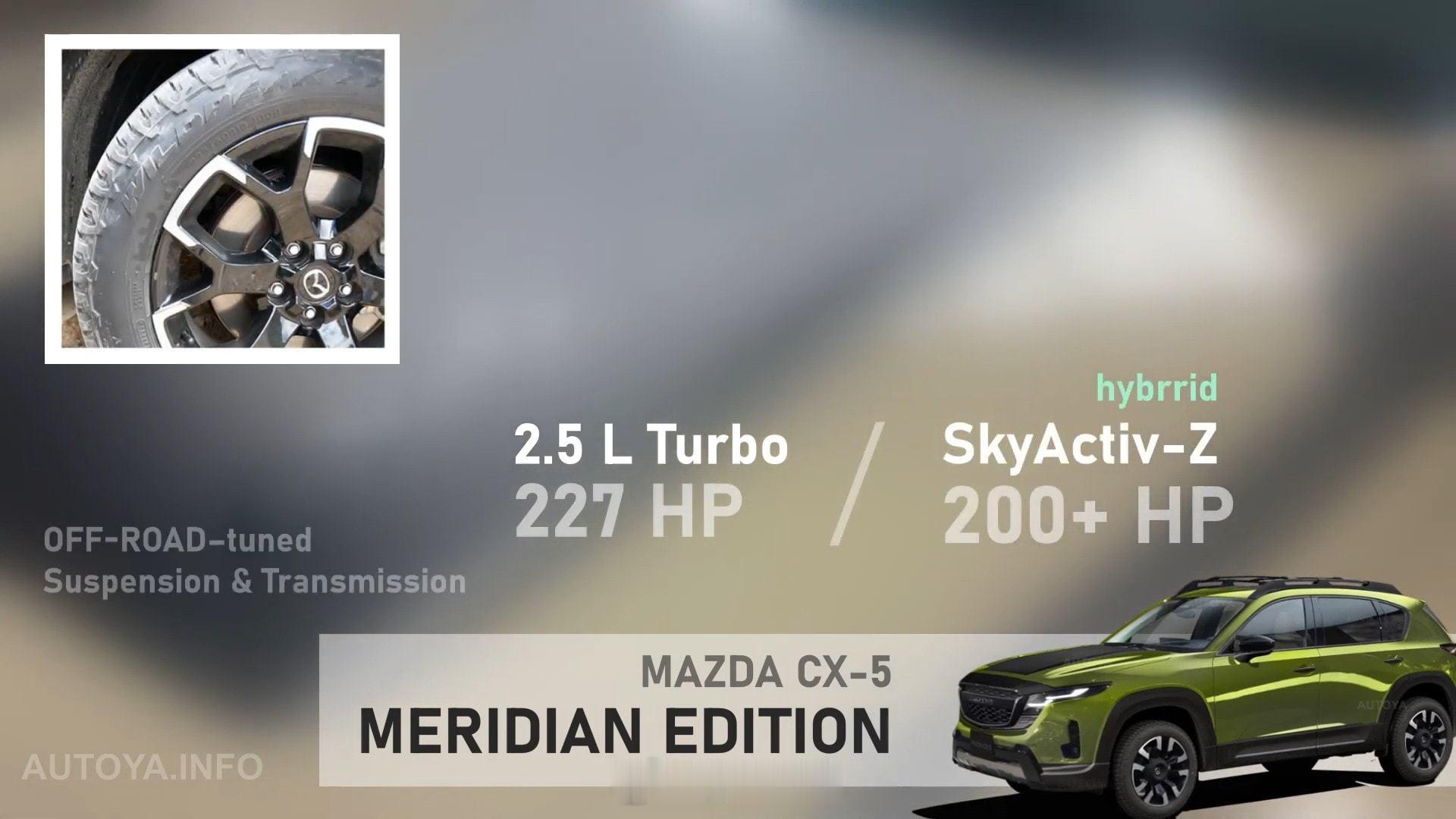 全新马自达CX-5 Meridian Edition渲染图 马自达CX-50曾推出过一款Meridian Edition特别版,配备了运动套件,越野性能也有所提升,如果给全新一代CX-5也推出Meridian Edition特别版,下面的新车渲染效果图,大家觉得怎么样
