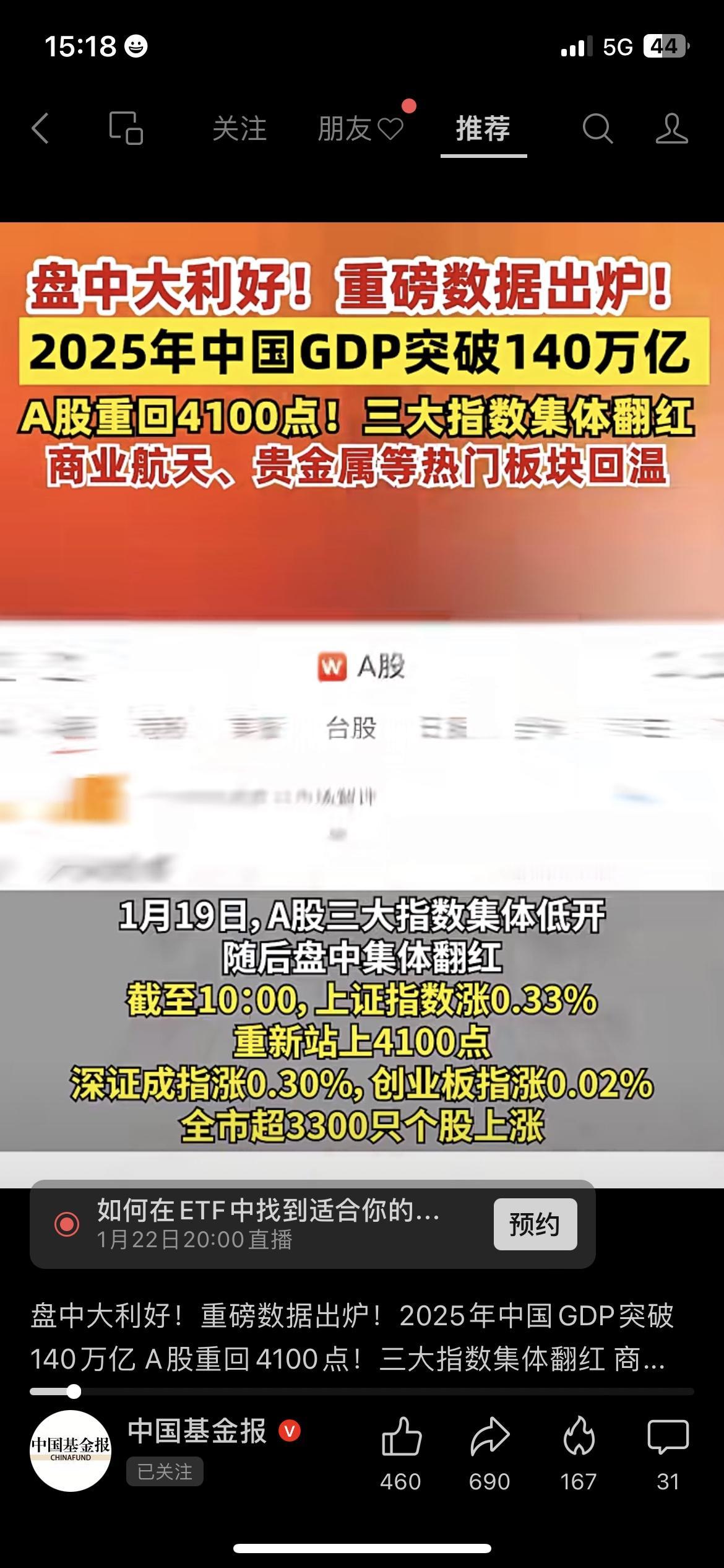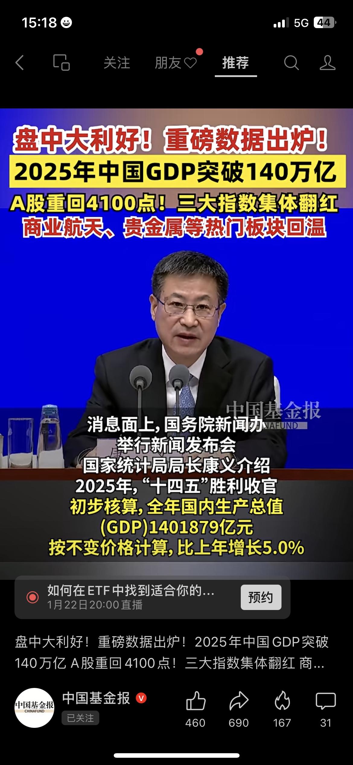 重磅!GDP突破140万亿!A股直接涨了! 国家统计局官宣:2025年GDP突破140万亿,增长5.0%!A股直接重回4100点,商业航天、贵金属板块集体回温。我做基金的朋友说,这波数据利好稳了,他准备加仓科技ETF。懂的都懂,国家经济稳,咱们的钱包才稳。 GDP涨的不是数字,是普通人的底气。 市场有风险,投资需谨慎。 你会加仓科技ETF吗?是果断入场,还是再观望观望? GDP 财经热点
