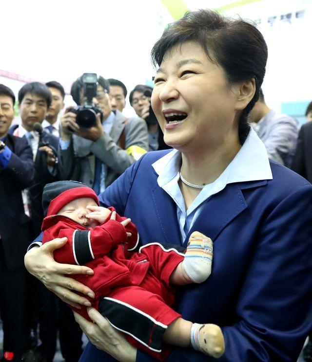 朴槿惠怀中的娃娃长得好像她,她抱着娃娃笑呵呵,不知道的人还以为是奶奶抱着孙子乐开怀呢。