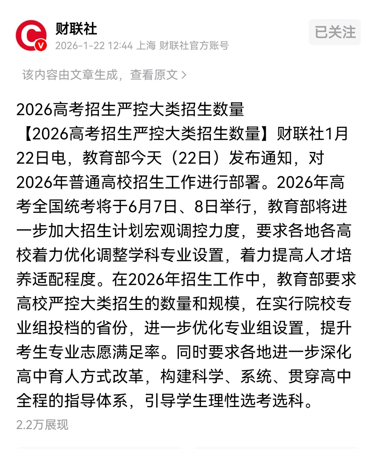 大类招生、培养改革,本来是以通识教育为办学定位的大学的正确方向,要拓宽专业面,重视基础能力培养。 而大类招生被质疑存在“陷阱”,是因有的大学没有进行大类培养改革,是把冷门专业和热门专业“打包”在一起招生。对此,不应该限制大类招生,而应该推进高校进行真正的大类招生培养改革。 对于以就业为导向的职业院校,则应按专业进行招生,因为职业教育培养的就是专业技能。