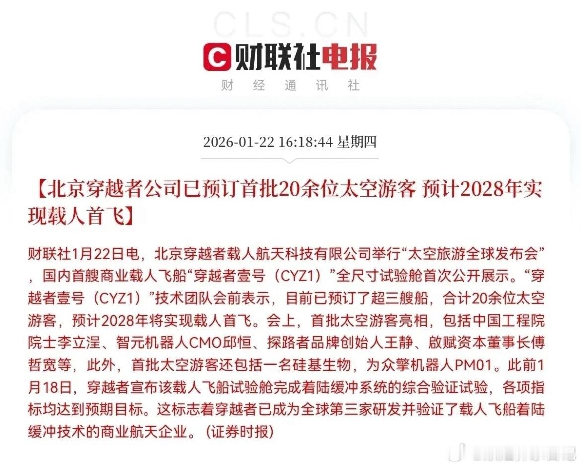 盘后利好——商业航天板块!北京穿越者公司发布“穿越者壹号”商业载人飞船,宣布2028年实现载人首飞并已预订20余位太空游客,标志着国内商业载人航天进入实质性落地阶段。这一事件不仅突破了民营资本在航天领域的技术壁垒,更打开了太空旅游、商业载人运输等新场景的商业化空间,将直接带动火箭发射、飞船制造、航天材料、测控通信等产业链上下游需求,叠加国内商业航天政策的持续支持,相关具备技术储备和量产能力的主板企业将迎来订单与估值的双重提升。受益概念股梳理1. 中国卫星:国内卫星制造龙头,布局商业卫星组网及微小卫星业务,技术实力雄厚,受益于商业航天卫星发射需求增长,产能持续扩张,订单稳定性强,具备长期增长潜力。2. 航天电子:航天电子设备核心供应商,为火箭、飞船提供测控通信、导航定位等关键设备,技术壁垒深厚,商业航天订单占比逐步提升,业绩增长确定性较强。3. 航天动力:火箭发动机及流体机械龙头,专注于液体火箭发动机研发,具备商业化量产能力,受益于商业火箭发射需求爆发,产能加速释放,新业务贡献增量。4. 中航光电:高端连接器龙头,产品广泛应用于航天装备的电气连接,技术领先,客户资源优质,商业航天领域订单增长明确,业绩稳健性突出。5. 航天科技:航天系统集成核心企业,布局商业火箭发射及卫星应用业务,具备全产业链整合能力,受益于商业航天场景落地,技术迭代速度领先。6. 中国卫通:国内卫星通信运营商龙头,拥有丰富的卫星资源,为太空旅游提供通信保障服务,受益于商业载人航天的通信需求增长,用户规模持续扩大。7. 北斗星通:北斗导航定位龙头,产品用于飞船及卫星的导航系统,技术储备深厚,商业航天领域订单稳步增长,国产替代进程加速。8. 四创电子:雷达测控及卫星通信设备供应商,为商业航天提供测控雷达及通信终端,技术实力雄厚,客户覆盖头部航天企业,需求稳定增长。9. 久之洋:红外探测设备龙头,产品用于飞船的红外成像及探测系统,技术壁垒显著,商业航天领域应用场景逐步拓展,订单增长可期。10. 航天长峰:航天装备配套商,提供飞船生命保障系统及特种电子设备,技术积累深厚,受益于商业载人航天的配套需求,业绩具备弹性。11. 康拓红外:航天测控设备龙头,为飞船及卫星提供姿态控制及测控系统,技术领先,商业航天订单占比提升,产能逐步释放。12. 中天火箭:商业火箭发射服务商,具备固体火箭发射能力,布局商业卫星发射及太空旅游配套服务,订单增长明确,新业务快速落地。13. 天银机电:航天电子配套商,提供星敏感器及航天电源设备,技术实力突出,商业航天领域客户合作紧密,订单稳定性强。14. 航天晨光:航天特种装备制造商,提供飞船结构件及特种压力容器,具备精密制造能力,受益于商业载人航天的装备需求,产能持续扩张。15. 航宇科技:航空航天结构件龙头,为飞船及火箭提供精密结构件,技术壁垒深厚,客户资源优质,商业航天订单增长带动业绩提升。16. 新研股份:航天航空零部件供应商,提供精密锻造及钣金部件,具备大规模量产能力,受益于商业航天装备需求增长,新业务贡献增量。17. 宝钛股份:钛材龙头,产品用于飞船及火箭的结构材料,具备技术储备和产能优势,商业航天领域需求增长带动钛材销量提升。18. 钢研高纳:高温合金龙头,产品用于火箭发动机及飞船部件,技术领先,商业航天订单占比逐步提升,业绩增长确定性较强。19. 菲利华:石英材料龙头,提供航天光学部件及石英纤维,技术实力雄厚,受益于商业航天光学设备需求增长,产能加速释放。20. 欧比特:卫星芯片龙头,提供星载SOC芯片及AI芯片,技术储备深厚,商业卫星及飞船的芯片需求增长带动订单提升,国产替代空间广阔。总结北京穿越者公司商业载人飞船的实质性进展,为国内商业航天产业注入了强劲动力,打开了太空旅游、商业运输等全新场景的商业化空间。A股主板相关概念股中,具备核心技术、量产能力及下游客户绑定的企业,将充分受益于行业爆发。短期事件催化下板块热度提升,长期需关注技术突破与订单落地节奏,建议聚焦火箭发射、飞船制造、航天材料等核心环节的龙头企业,把握产业升级带来的投资机会。