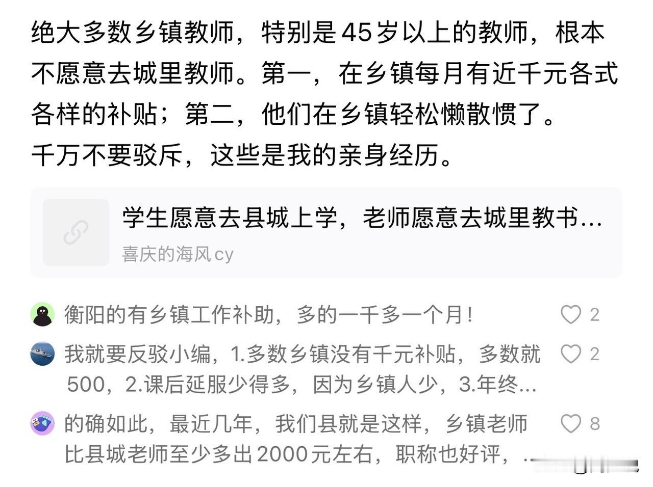 周少很认同这位教师的观点,现在乡镇教师确实是这么个情况,45岁以上的教师,确实喜欢待在乡镇教书,不止是有乡镇补贴那么简单,更重要的是凭职称比城里要轻松点,教学压力更没那么大….#寻美三湘# #长沙新朋友#