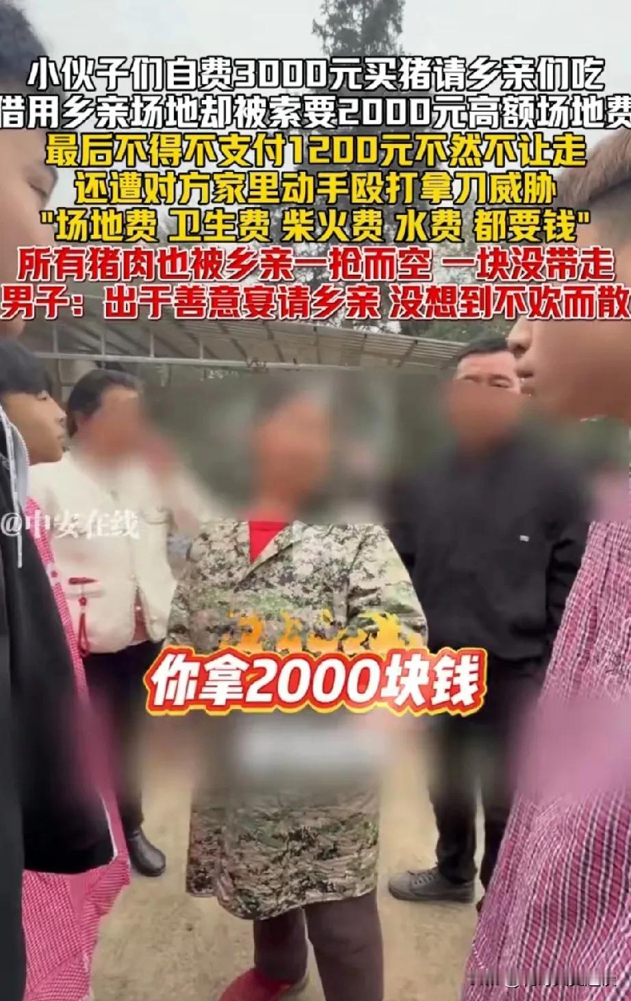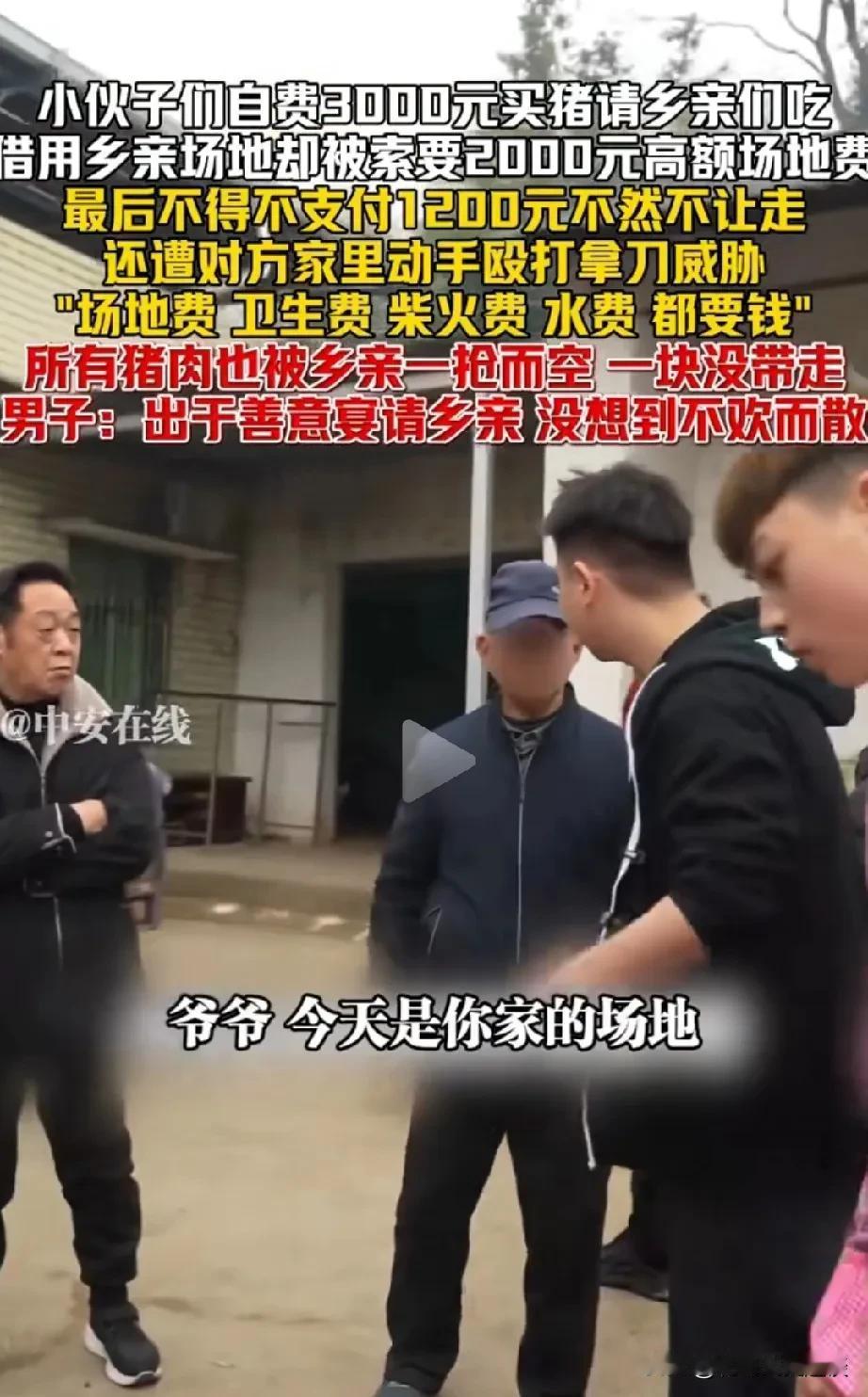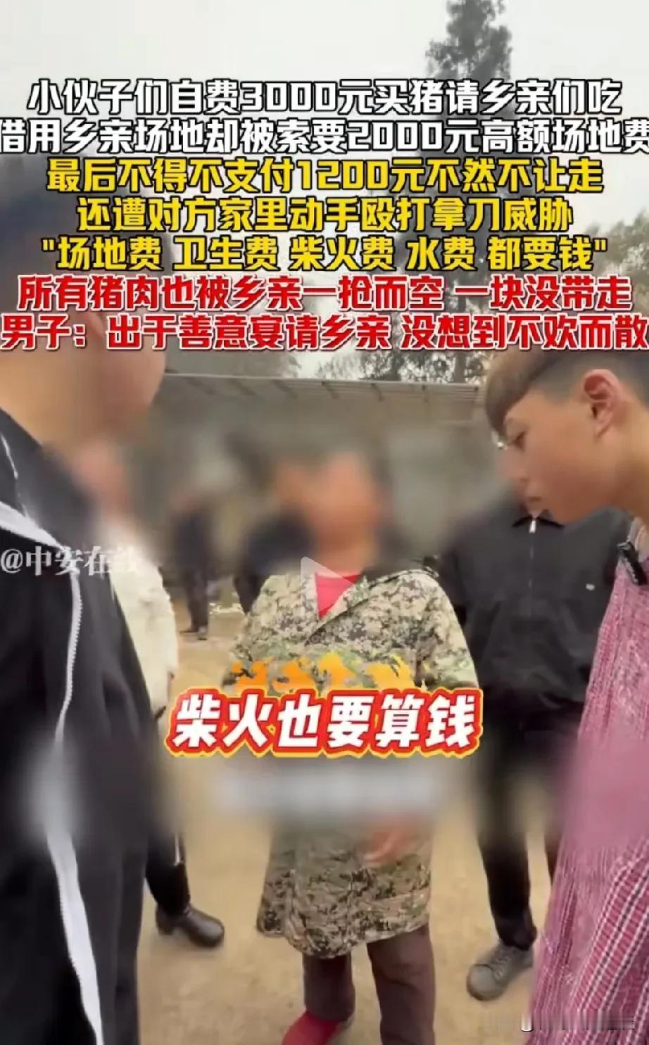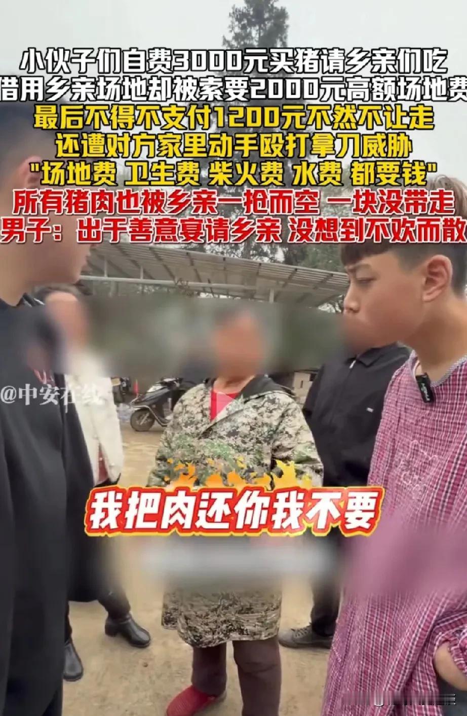 小伙子免费请村里老人吃猪肉,结果被老人摆了一道。小伙子花了3000块钱买一头猪,杀猪,请村里的大家伙免费吃猪肉,凡是到场的老人,人手一块猪肉。但是占用人家场地的老人不愿意了,她要收场地费,柴火费,水费,合计要2000块钱。给她的一块猪肉她也不要了。 有人说老人不知足,免费吃猪肉还不满足,事太多。用了一下场地还要那么多钱。 可能小伙子是利用杀猪分肉搞直播,大家一看有钱赚,老人不愿意,用了他家那么多柴,也要收钱。老人做法你认同吗?