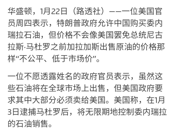 委立法机构一读通过油气改革相关法案路透社:一位美国官员22日表示,美国政府允许中国购买委内瑞拉石油,但不能以低于马杜罗时期的价格购买。