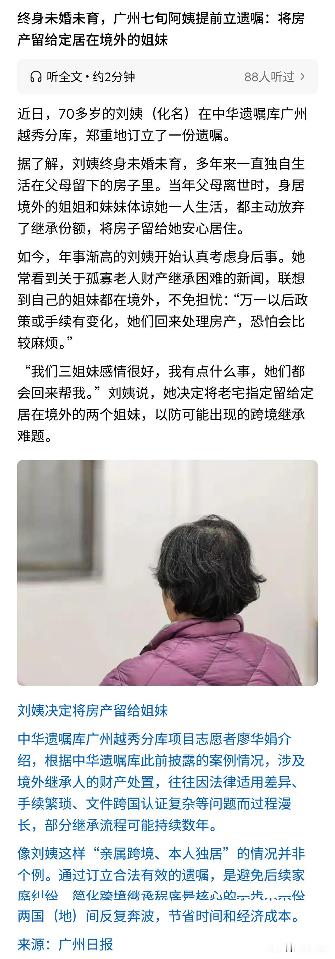 论老人家观念先进,还是要看我们老广们!前有何伯夫妇立遗嘱把房子留给外孙,今有刘姨立遗嘱把房子留给定居境外的两个妹妹! 70多岁的刘阿姨终身未婚未育,多年来独自生活在父母留下的房子里。 在广州无依无靠,亲人只剩下姐姐和妹妹,但都身居境外。当年父母走时,姐妹们为了照顾她,放弃了房子的继承权,把房子留给刘姨居住。 现在刘姨年事已高,为了避免身后事麻烦,把房产指定给两个妹妹,避免了日后境外的妹妹无法继承而被“相关部门”接收。 父母的房子其他姐妹也有份,只是当初放弃了,现在刘姨觉得百年之后留给妹妹们,也是合情合理。 其实,这种情况在广东相当普遍,广东地处南海北岸,有众多海外华侨华人,很多家庭都有海外亲戚。 至今广东都流行出国,以前是下南洋谋生,现在是去欧美加拿大澳洲等发达国家和地区居多。 几乎每个广州人都能找到在海外的亲戚朋友。