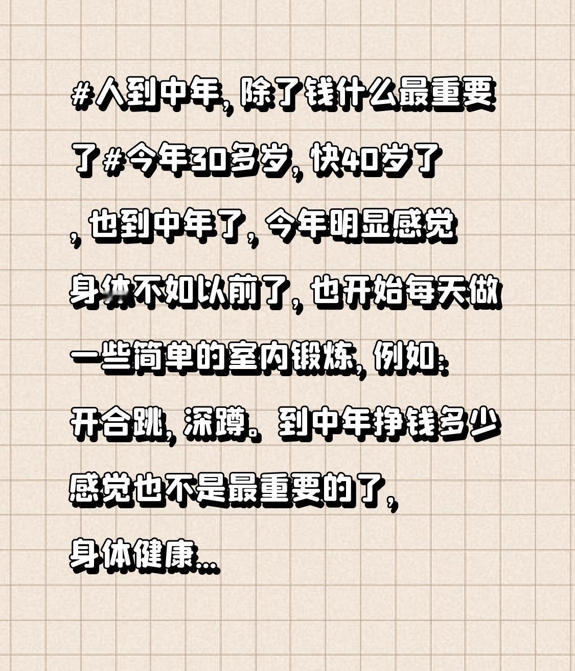 今年30多岁,快40岁了,也到中年了,今年明显感觉身体不如以前了,也开始每天做一些简单的室内锻炼,例如:开合跳,深蹲。到中年挣钱多少感觉也不是最重要的了,身体健康最重要!大家觉得呢?评论区讨论一下吧![捂脸][捂脸][捂脸] 中年危机
