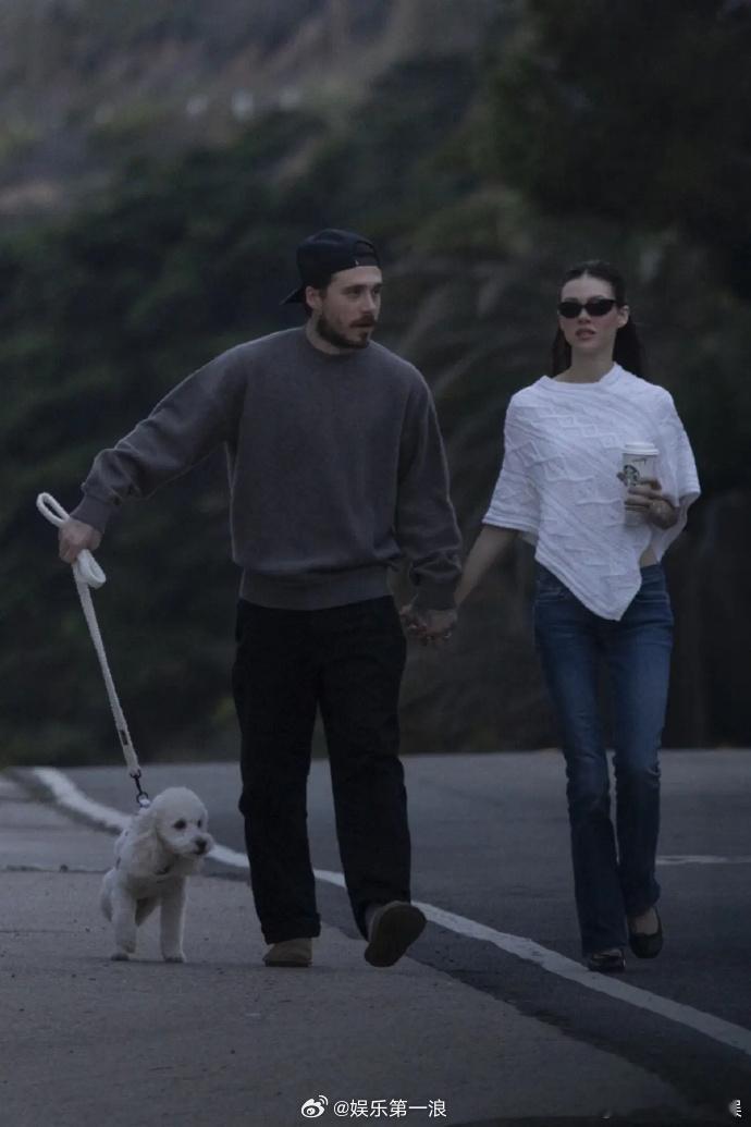 贝克汉姆大儿子风波后首现身贝克汉姆大儿子和妻子海滩散步遛狗 贝克汉姆大儿子风波后