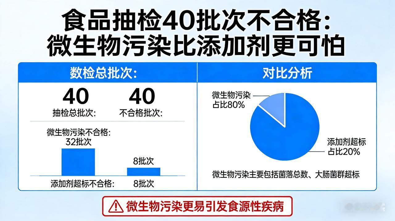 食品抽检 40 批次不合格,微生物污染比添加剂更可怕 标题:添加剂只是冰山一角!央视实锤:这40批“问题食品”正在摧毁你的健康! 食品安全的遮羞布,又被狠狠撕开了一道口子!国家市场监管总局最新通报令人触目惊心:2136批次样品中,竟有40批次检出不合格。这不仅仅是数字的冰冷,更是对公众信任的无情践踏。请记住,超标的添加剂只是冰山浮出水面的那一角,水面之下,是令人作呕的造假深渊。 看看这些披着“美食”外衣的“慢性毒药”: 湖北随县的“纯谷酒”,本该是粮食精华,却被查出添加安赛蜜和甜蜜素。商家用廉价的化学甜味剂掩盖劣质酒体的辛辣苦涩,你喝下的每一口都是对肝脏的伤害; 安徽绩溪的菜籽油,苯并(a)芘严重超标。这是一种强致癌物,意味着商家极可能收购了高温反复炸烤的“地沟油”或劣质油自行灌装; 更荒诞的是坐拥千万粉丝的网红带货的“纯红薯粉条”,送检竟未检出红薯成分,全是廉价木薯粉滥竽充数!为了口感,甚至违规添加明矾。 此外,西麦中老年燕麦片菌落总数爆表,几乎成了细菌培养基;拼多多的益生菌驼乳蛋白粉霉菌超标,花高价买回的竟是“智商税”。尤其是老人和孩子,他们的免疫系统脆弱,一次腹泻、一场感染,都可能成为压垮身体的最后一根稻草。 更令人心寒的是,近半问题食品竟流向了抖音、快手等直播间。虚假宣传、货源不明、“三无”产品贴上“进口”标签,就敢堂而皇之地卖给消费者。 食品安全大于天!从今天起,请扔掉盲目信任:买油看等级、买酒看配料、买粉条看颜色。遇到问题,保留证据,拨打12315死磕到底!别让你的一顿饭,成为全家人的“赌命局”!