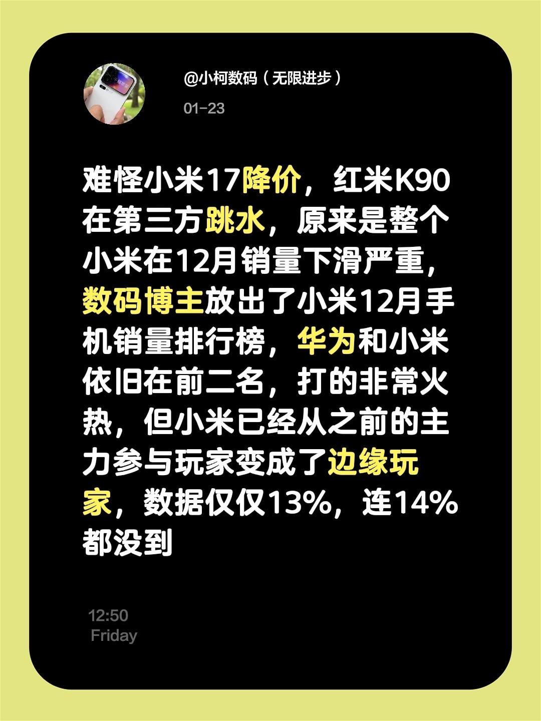 难怪小米17降价,红米K90在第三方跳水,原来是整个小米在12月销量下滑严重,数码博主放出了小米12月手机销量排行榜,华为和小米依旧在前二名,打的非常火热,但小米已经从之前的主力参与玩家变成了边缘玩家,数据仅仅13%,连14%都没到
