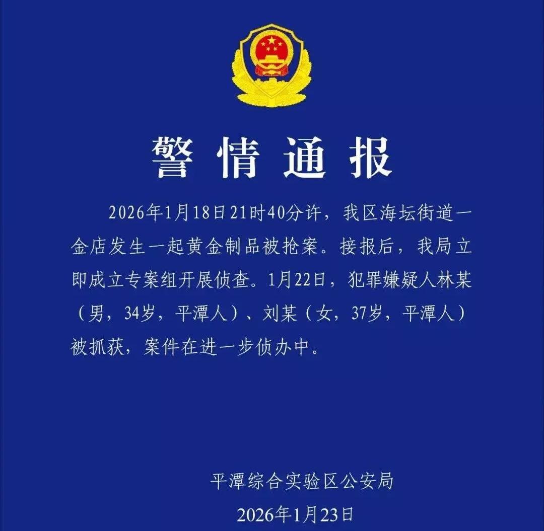 胆大包天!福建金店遭电击抢劫,警方4天火速破案,大快人心! 家人们快看!福建平潭一金店竟遭暴力抢劫,嫌疑人戴着头盔从卷帘门门缝钻进去,手持电棒电击店主,还砸坏货柜抢走黄金,简直无法无天! 法网恢恢之下竟敢公然施暴抢劫,还好咱中国警察办事雷厉风行!接警后立刻成立专案组,调取监控全力侦查,短短4天就把34岁的林某和37岁的刘某两名嫌疑人抓获归案,这破案速度太给力了! 咱中国向来是法治社会,朗朗乾坤之下,任何违法犯罪行为都逃不过法律的制裁。警方的快速行动,既保护了商家财产安全,也守住了老百姓的安全感,这就是咱中国警力的硬核实力! 不过案件还在进一步侦办,嫌疑人为啥铤而走险?抢来的黄金是否追回?评论区聊聊你的猜测,一起等后续通报!金店遇抢匪 黄金抢劫案 金店抢劫犯