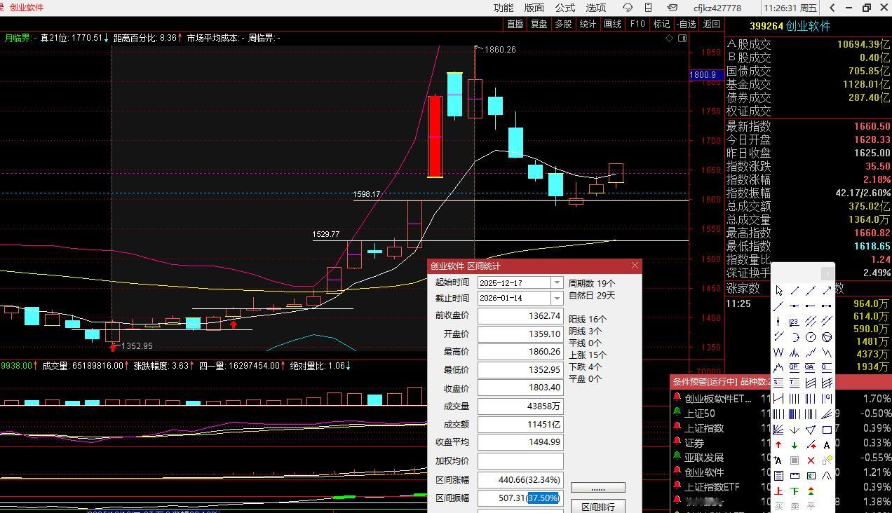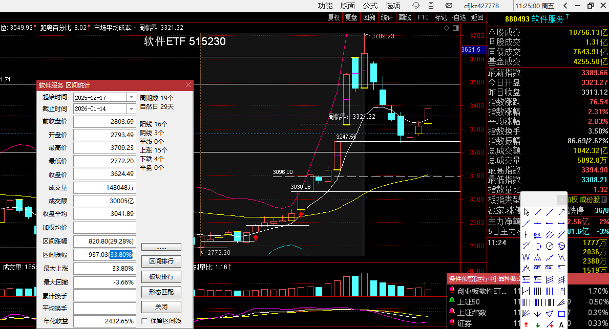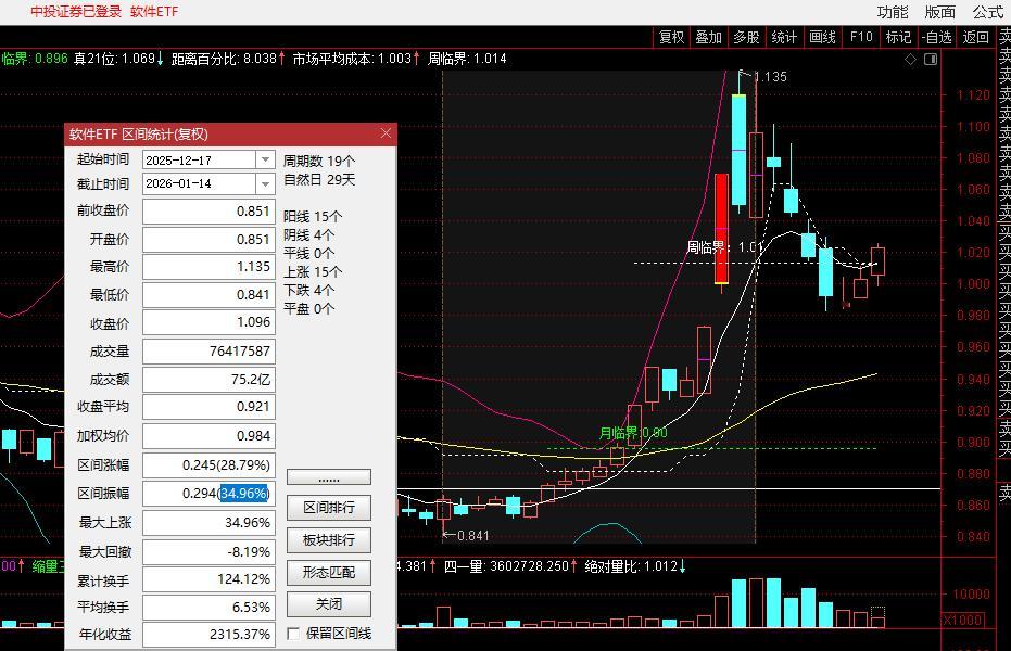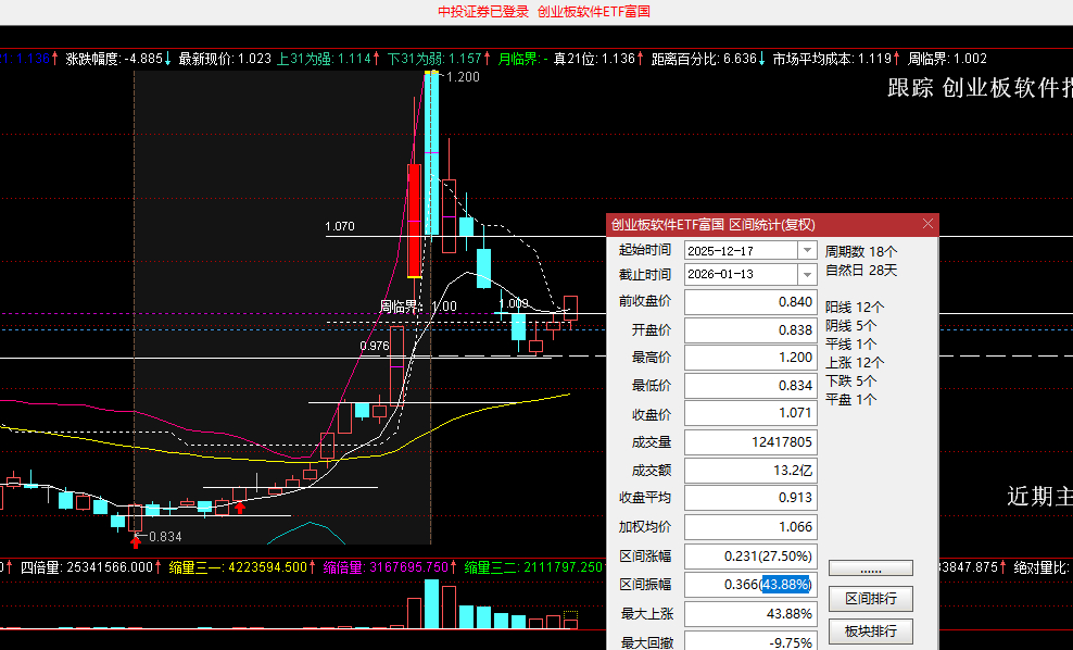 强烈推荐深入研究这只场内ETF基金:创业板软件E富国,基金代码159107一直都在寻找一只可以长线跟踪的科技类ETF159107对应跟踪创业板软件指数399264同时与软件行业指数880493的波段节奏基本同步这个品种的好处在于比如最近的一个左侧拉升段,从去年12月17日到最高的1月14日880493软件指数,最大波段涨幅是33.80%(图1)515230软件ETF,最大波段涨幅是34.96%(图2)创业板软件指数399264,最大波段涨幅是37.5%(图3)创业板软件E富国159107,最大波段涨幅是43.44%(图4)也就是说,只要软件来了行情,做159107可以获得超过行业指数的涨幅收益,更重要的是ETF包揽很多个股,和个股一样跟踪,可以全仓或者大仓位去做,比做具体个股更稳妥。但是也要注意:如果和个股一样的追涨杀跌,创业板软件E富国,基金代码159107持股的具体个股全部都是创业板范围的软件股(图5),涨跌振幅同样扩大,乱做也容易在下跌过程比做具体个股亏的更多。比如前期最高1.20,跌到最低0.975,亏损就是1.2-0.975=0.225/1.2=18.75%,亏起来也狠,要考虑好,用什么方法去做。