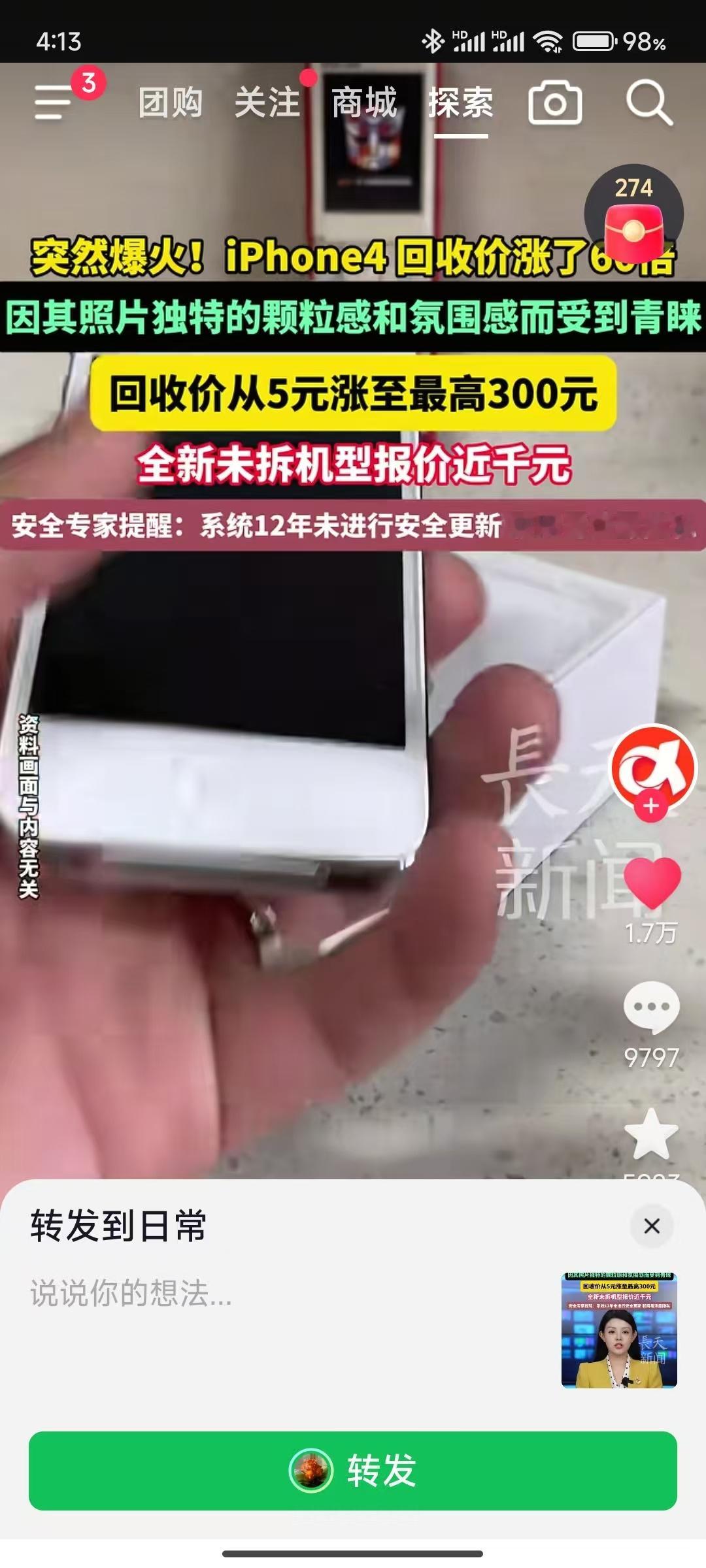 现在短视频危害最严重的其实是老年人,老年人对网络信息的辨别能力较弱,什么事儿都会信以为真。我姥姥经常拿着网上的段子告诉我这是真事。我爸也是,前几天刷到iPhone 4 暴涨60倍,还发给我看,问我还有没有了